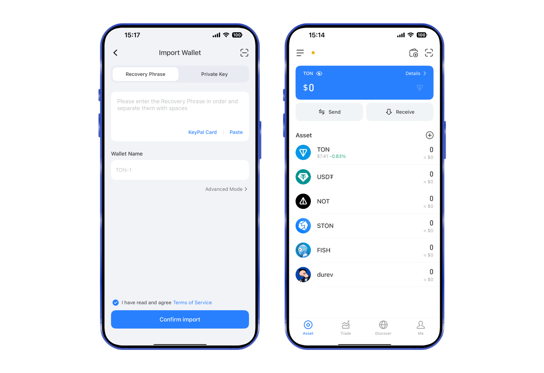 3. Enter your secret recovery phrase, set your wallet name, and click confirm. At this point, you have successfully imported a **TON** wallet.&#x20;