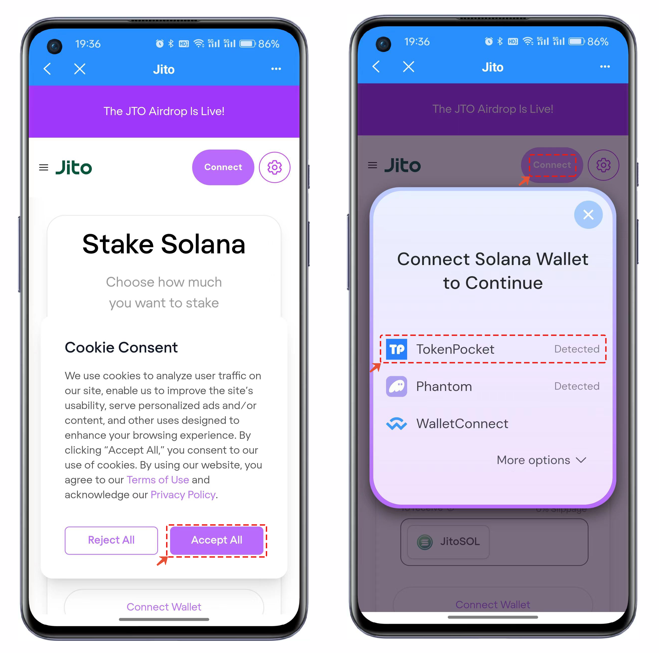 2. Please read the Cookie Consent for the first use, click on【Accept All】to agree. After completion, click on【Connect】in the upper right corner and choose TokenPocket to connect your wallet.