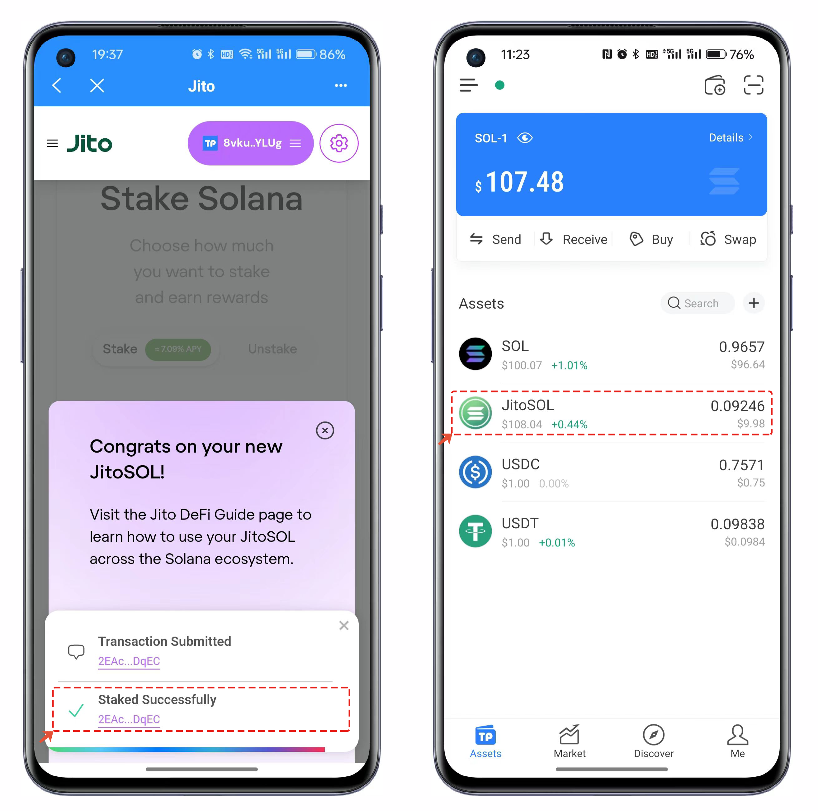 4. After completing the signature for the on-chain transaction, you will see a prompt indicating successful operation. Switching to the asset interface, you will be able to find the JitoSOL token already listed.
