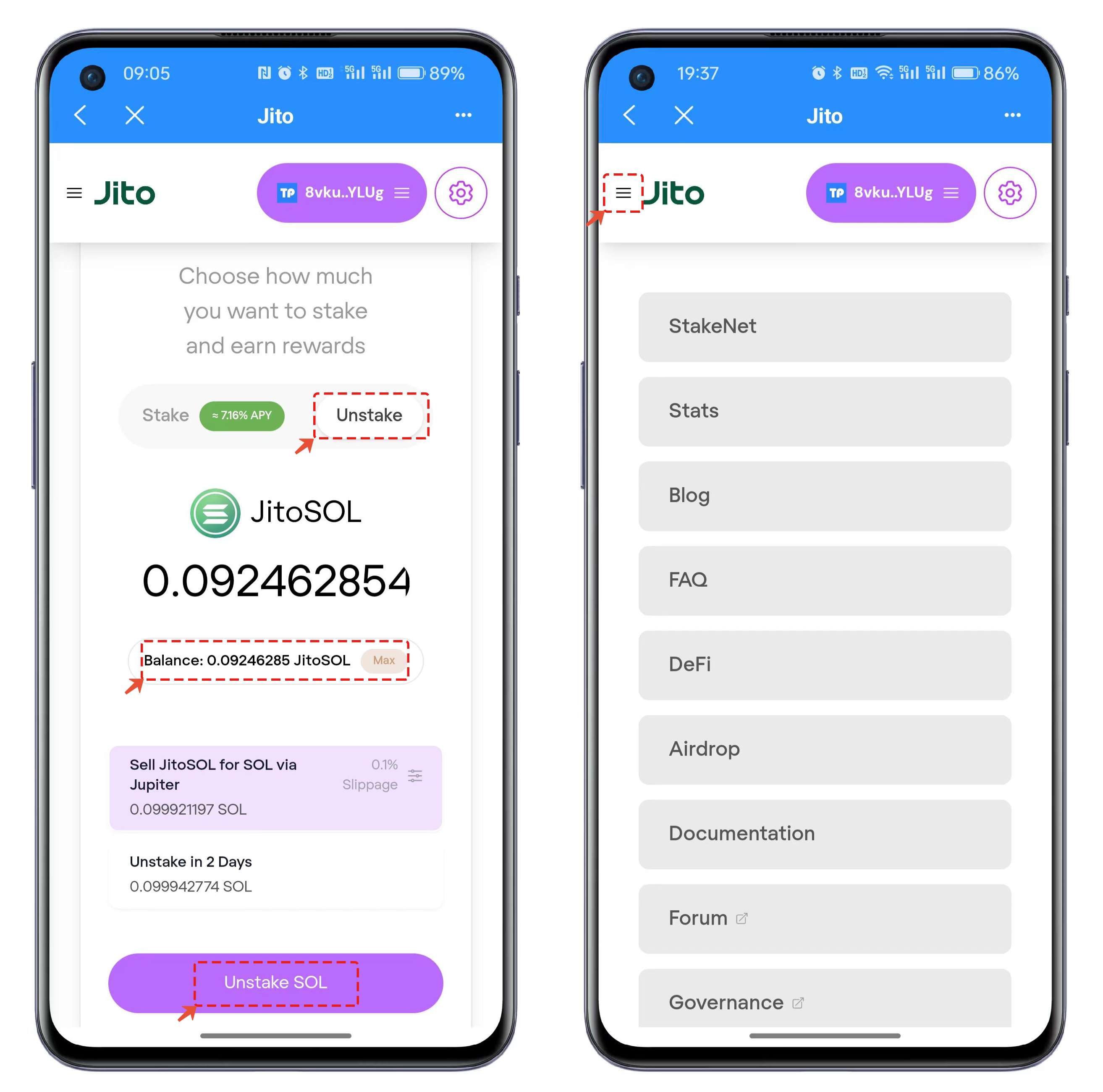5. If you need to unstake tokens, you can reopen Jito, switch to the "Unstake" menu, enter the quantity to unstake, execute "Unstake SOL," and after completing the on-chain operation, you can retrieve SOL. Other features of Jito can be accessed through the menu in the top left corner. For a comprehensive understanding of Jito's mechanics and rules, visit its official platform.