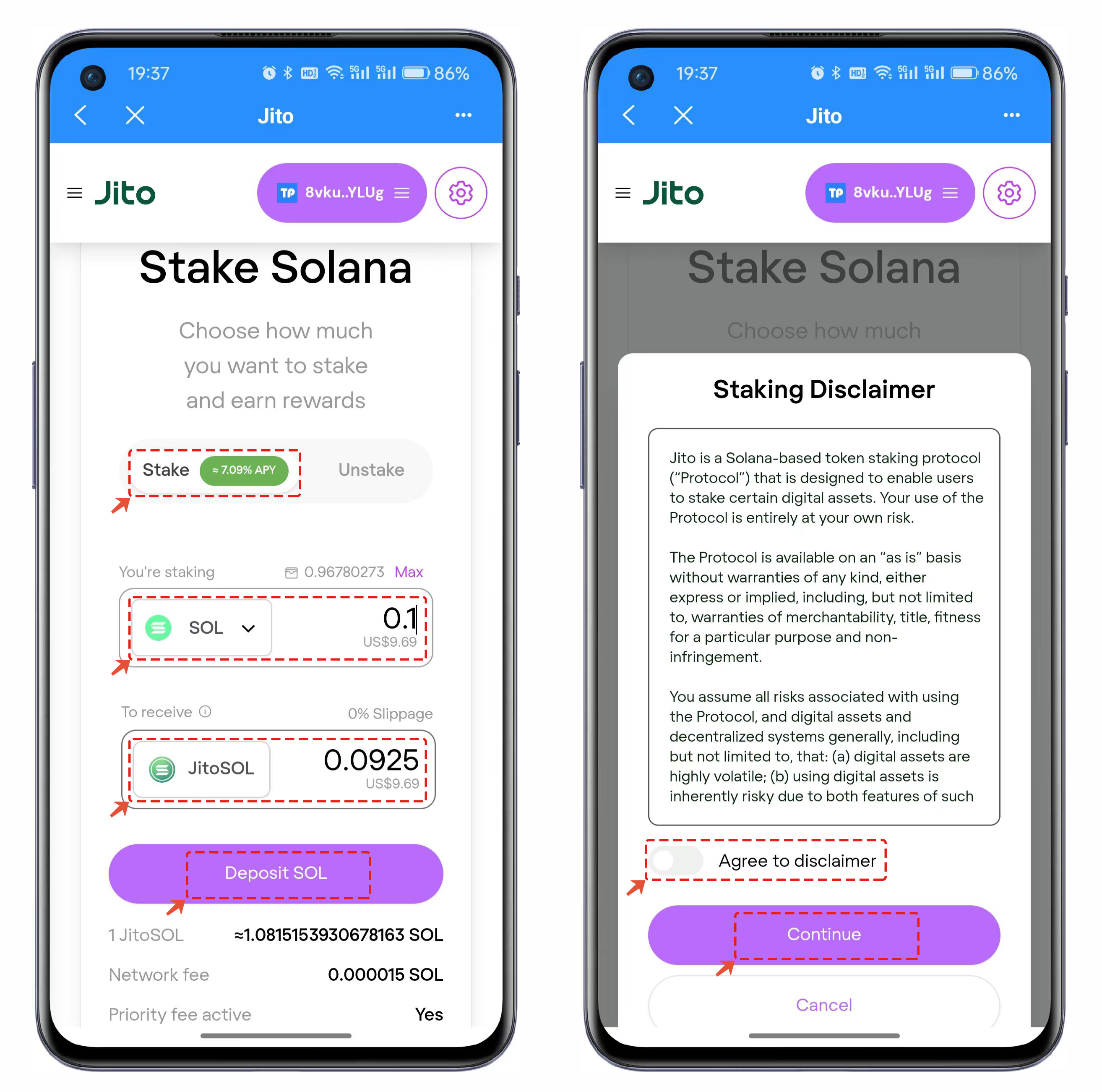 3. After successfully connecting the wallet, the default function is Stake. Simply enter the amount of SOL here, and the corresponding amount of JitoSOL will be automatically calculated. Finally, click on the bottom button "Deposit SOL," check "Agree to disclaimer" in the pop-up statement, and click "Continue."