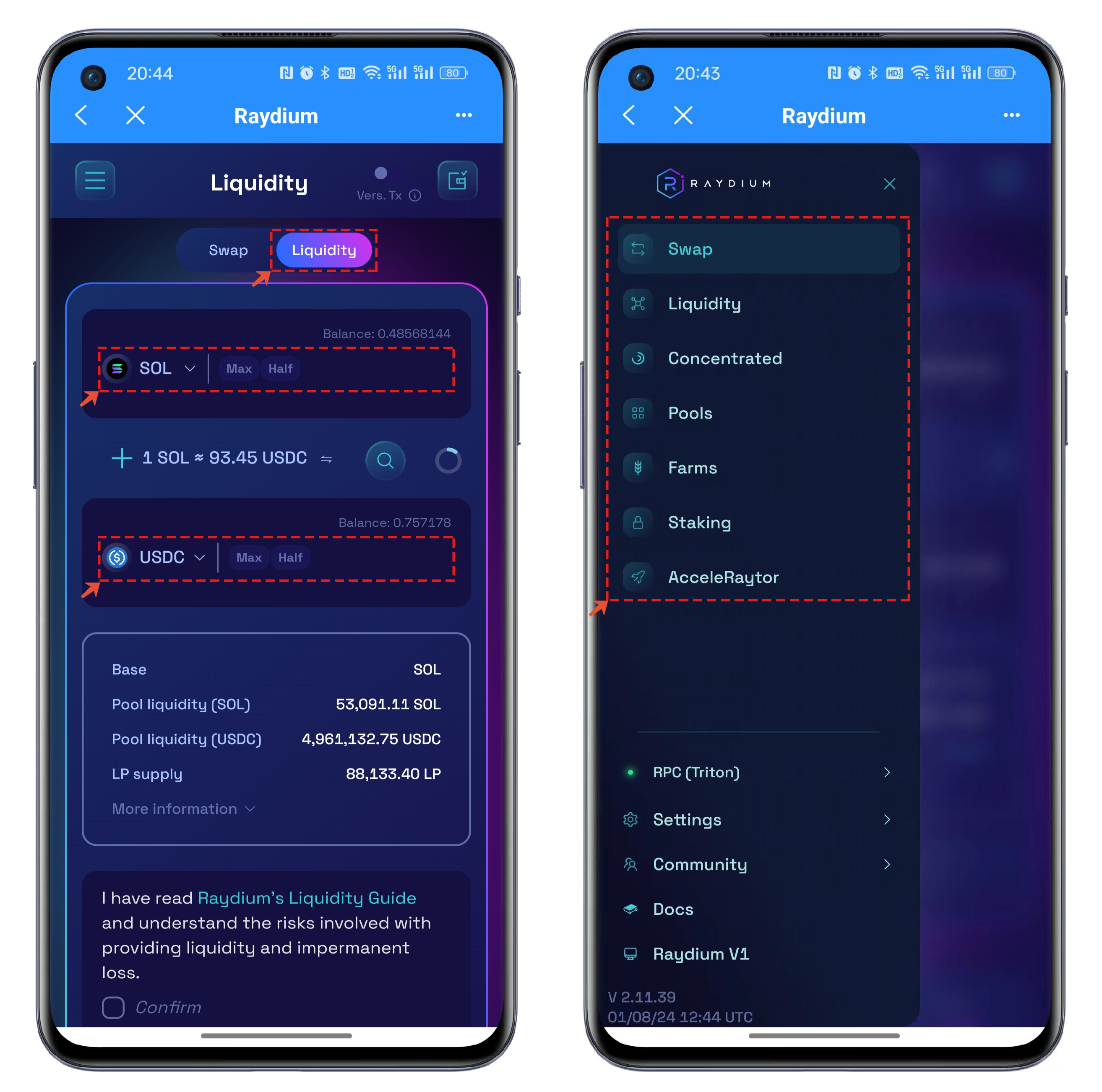 4. Next to the Swap function is Liquidity, which is also a familiar feature and interface. Simply set the two types of tokens and their quantities that you want to add liquidity for, and then execute the deposit to receive LP tokens. The menu in the top left corner of the interface integrates and displays all the functions of Raydium, which are everyday DeFi functions. You can choose based on your preferences and usage habits.