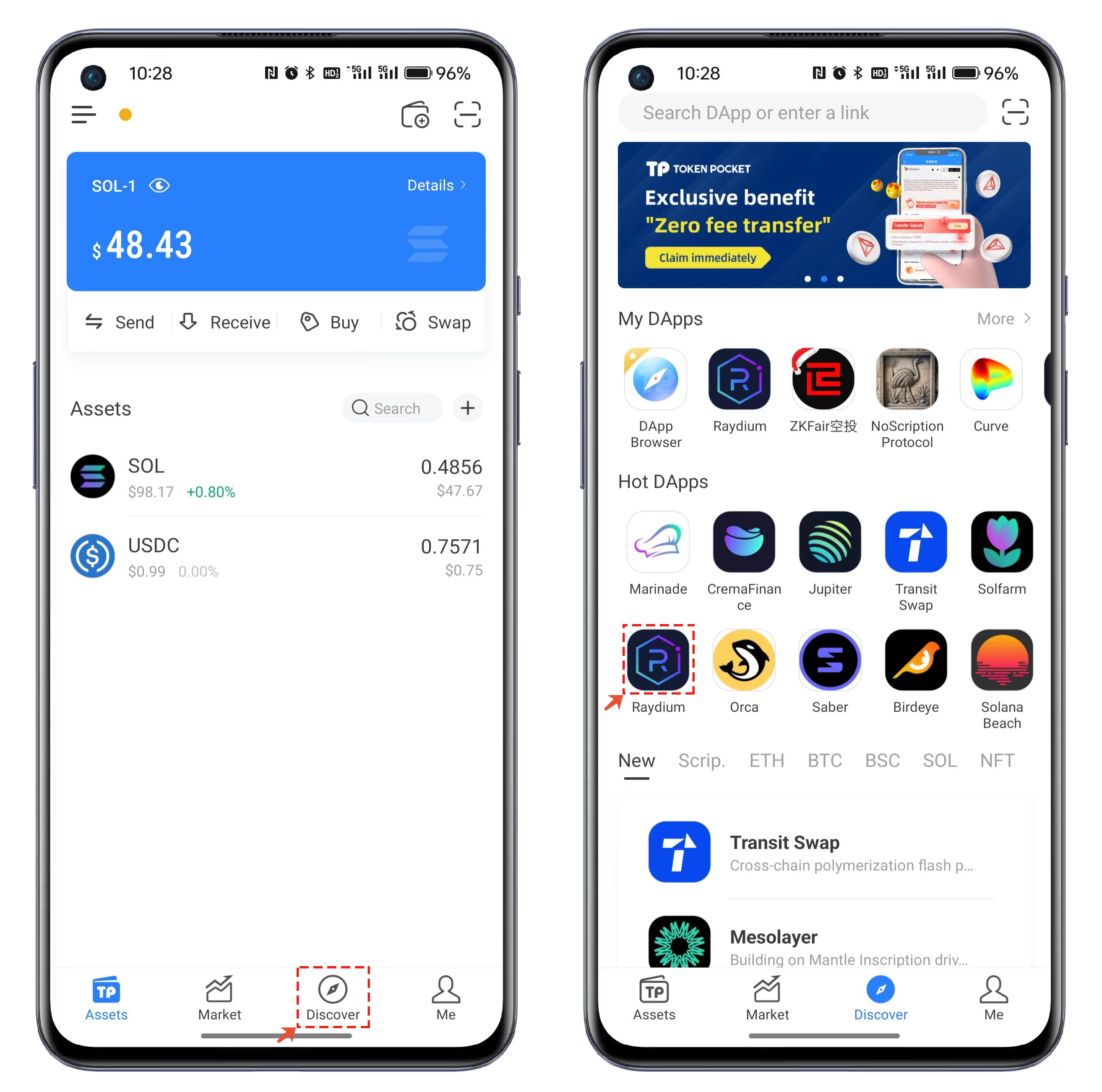 1. Open TokenPocket, tap the bottom "Discover" menu, and open Raydium in the "Popular DApps" section.