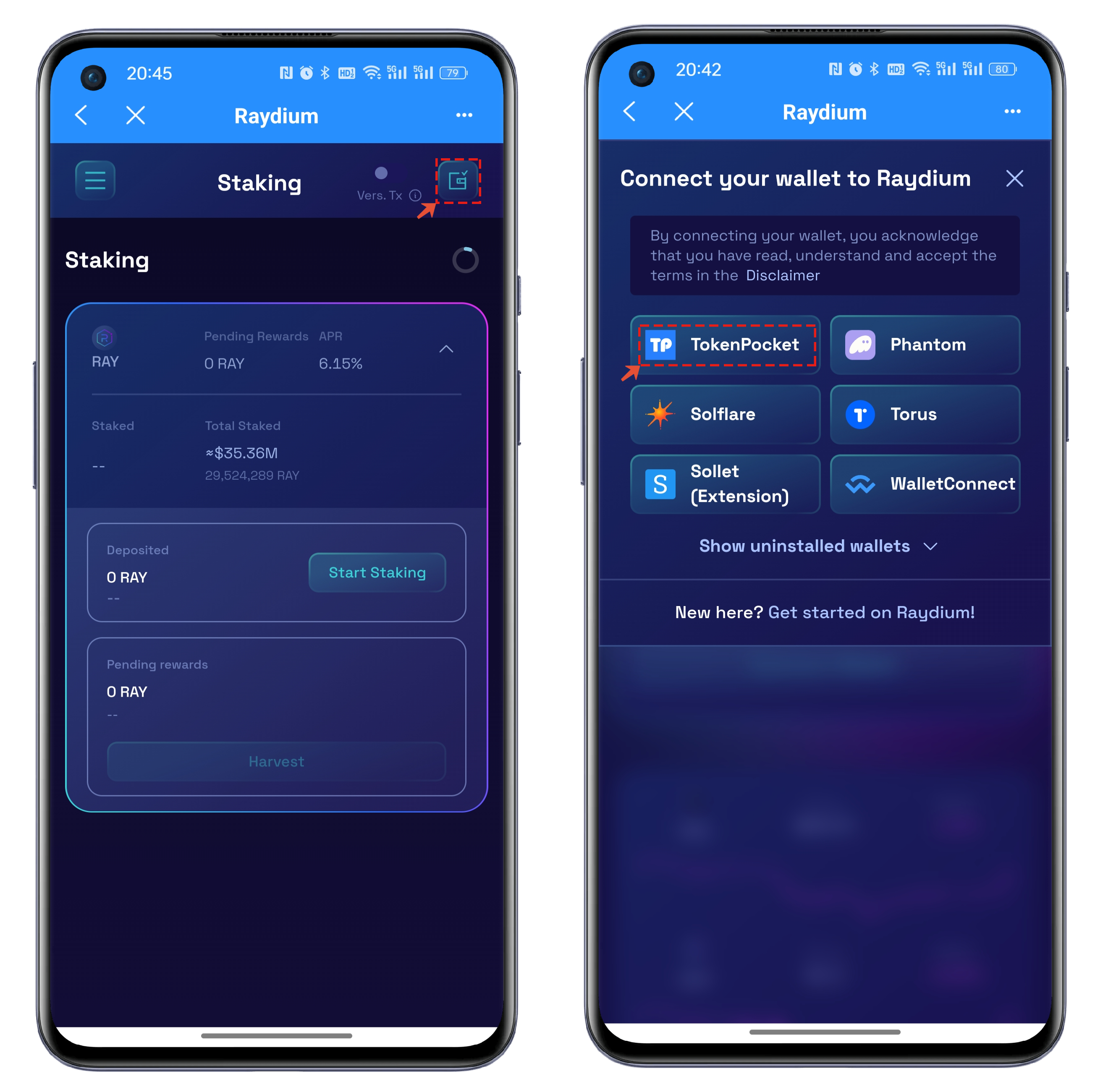 2. To use Raydium for the first time, click on the menu at the top right corner of the interface, and choose TokenPocket in the wallet connection interface.