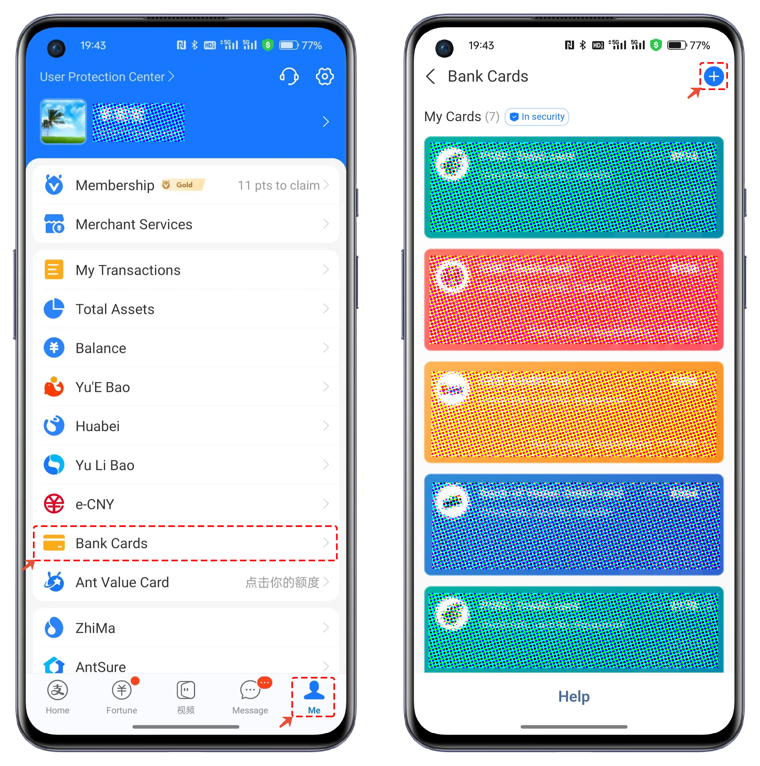 1. Open the Alipay app, click on <mark style="color:blue;">**\[Me]**</mark>, then click <mark style="color:blue;">**\[Bank Cards]**</mark>. In the bank cards interface, click the <mark style="color:blue;">**\[ + ]**</mark> button in the top right corner to add a new bank card.