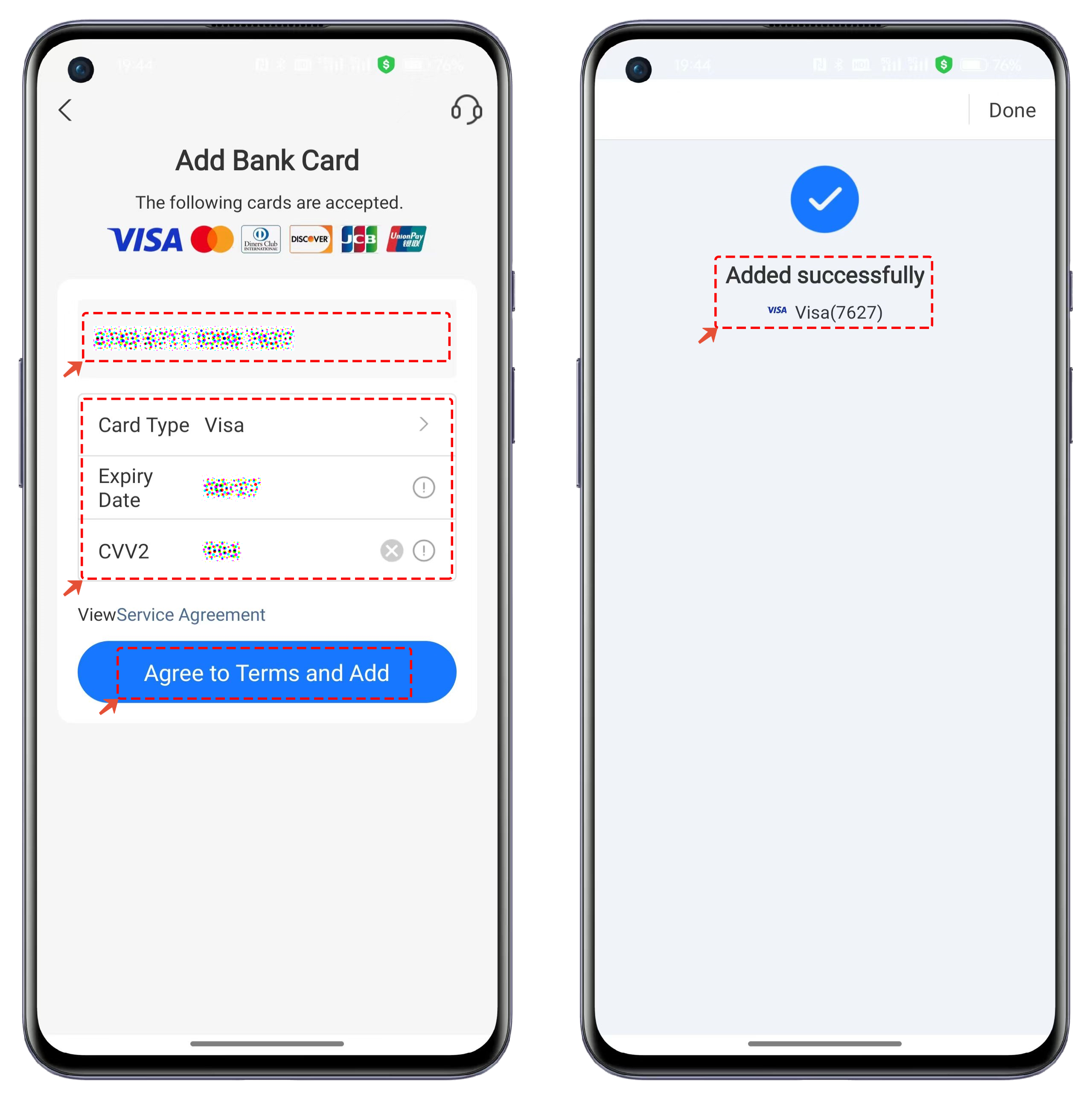 2. Enter the TP Card account number, expiration date, and CVV information, then click <mark style="color:blue;">**\[Agree to the Terms and Add]**</mark>. Once verified successfully, the card will be added.
