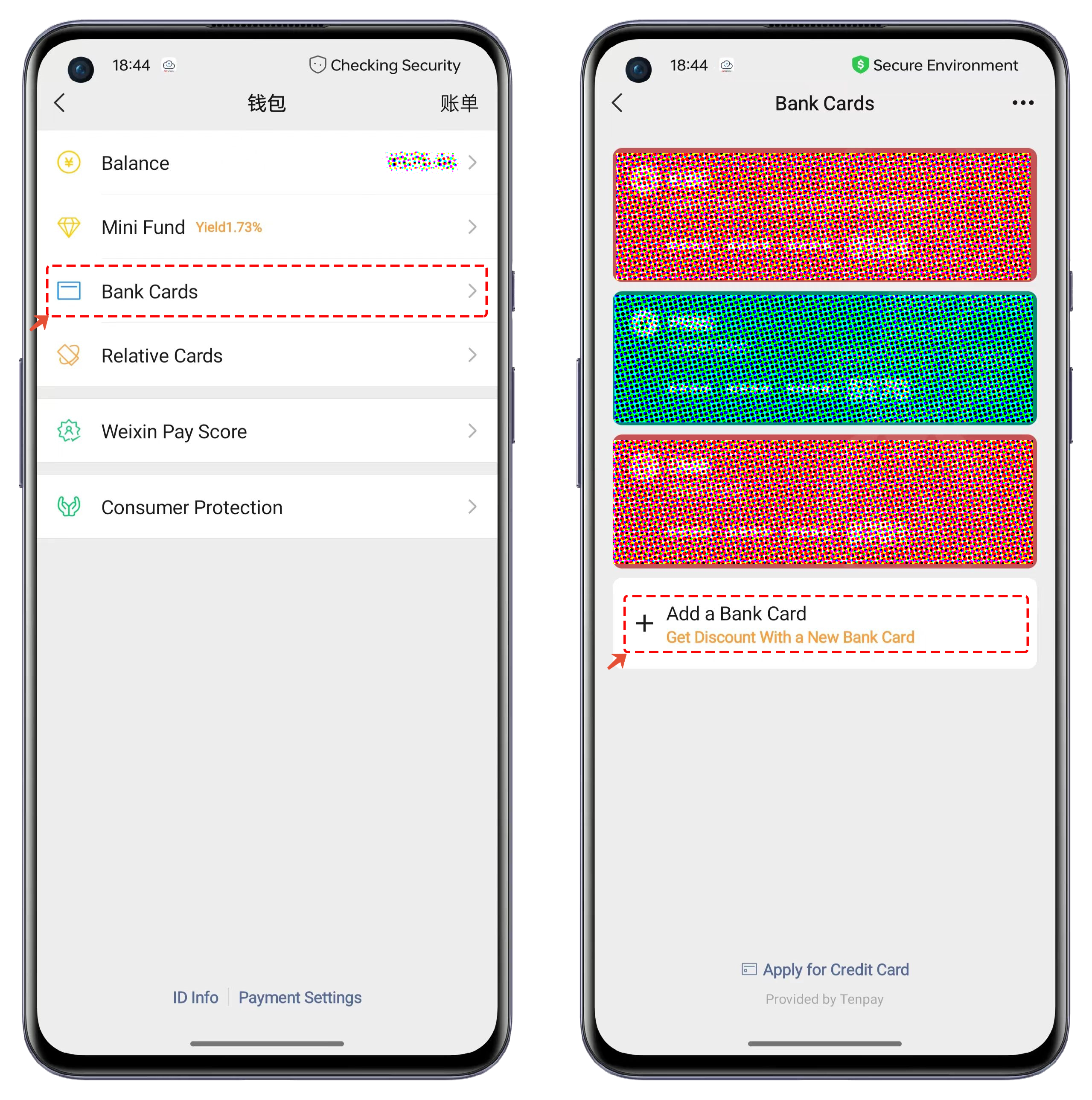 2. In the wallet interface, select <mark style="color:blue;">**\[Bank Cards]**</mark> and use the <mark style="color:blue;">**\[Add Bank Card]**</mark> function.