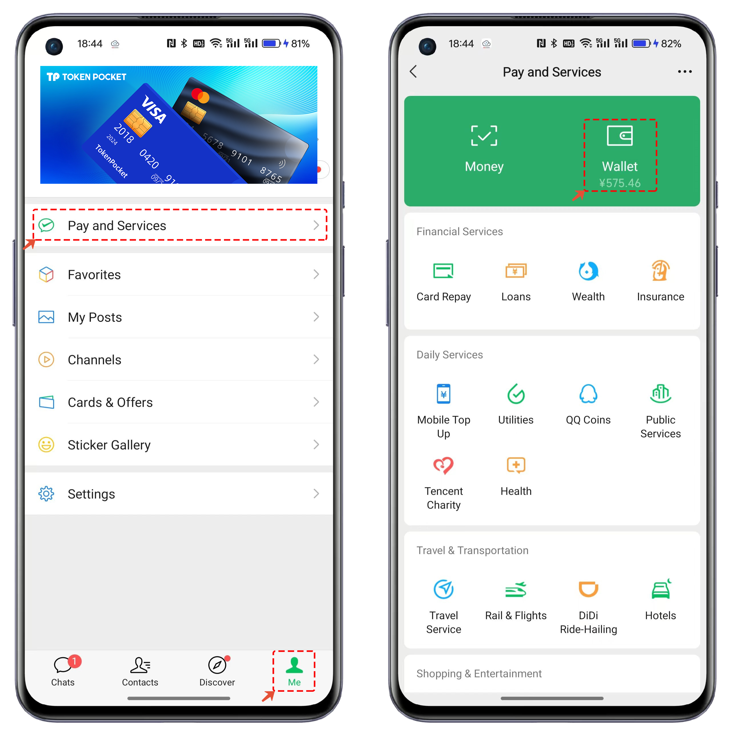 1. Open WeChat, click on <mark style="color:blue;">**\[Me]**</mark>, and in the interface, select the <mark style="color:blue;">**\[Pay and Services]**</mark> menu. In the services interface, click on the <mark style="color:blue;">**\[Wallet]**</mark> option.