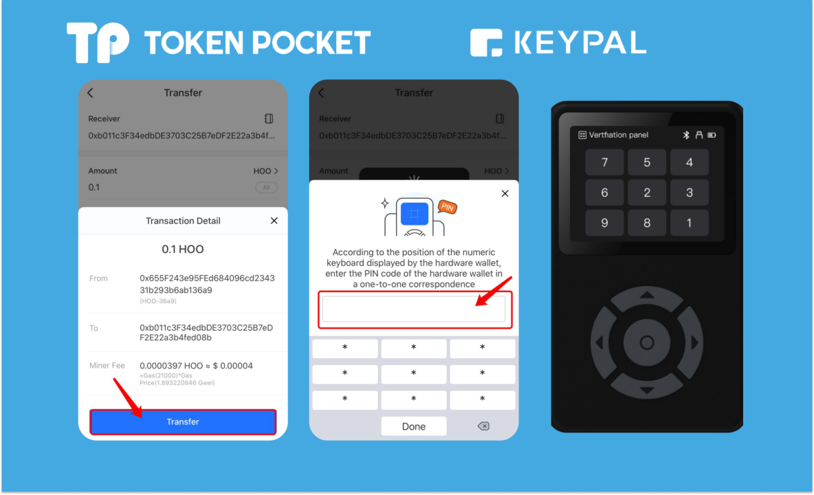 Open TokenPocket APP, click[Transfer], and enter the receiving address and the amount, click [Confirm], you need to enter the PIN code of your KeyPal in a one-to-one correspondence.