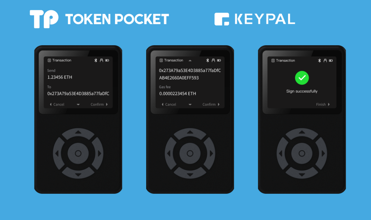 And you need to check the receiving address, transfer amount, and the gas fee on your KeyPal. After you have confirmed the information below, the KeyPal will show [Sign successfully], the transfer is successful.