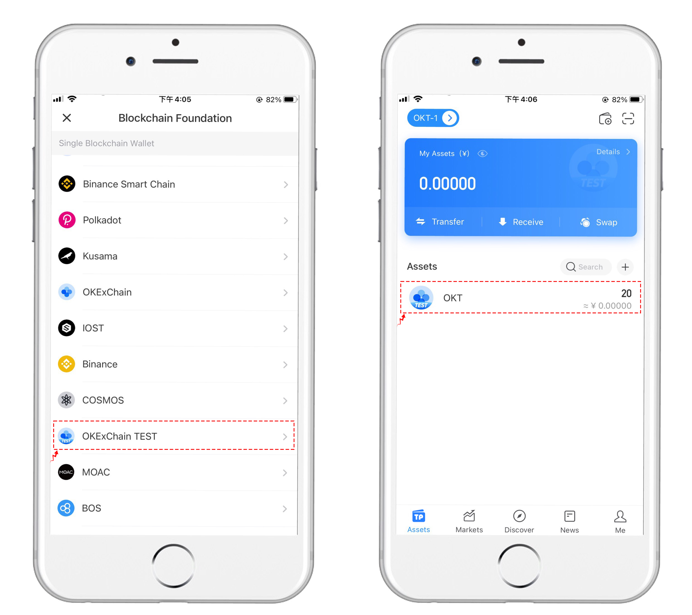 • The new OKExChain test chain is added to get rid of the cumbersome steps of testing nodes under Ethereum. After creating or importing a wallet, you can view the type and quantity of your test tokens (test coins have been added).