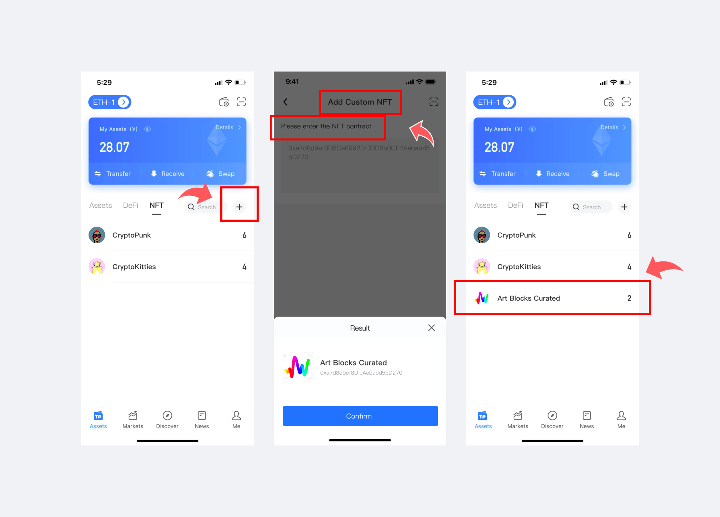 Click the [+] in the upper right corner, enter the page of [Add Custom NFT], enter the contract address, and check the information, click [Confirm]. At this point, you have added the custom NFT successfully.
