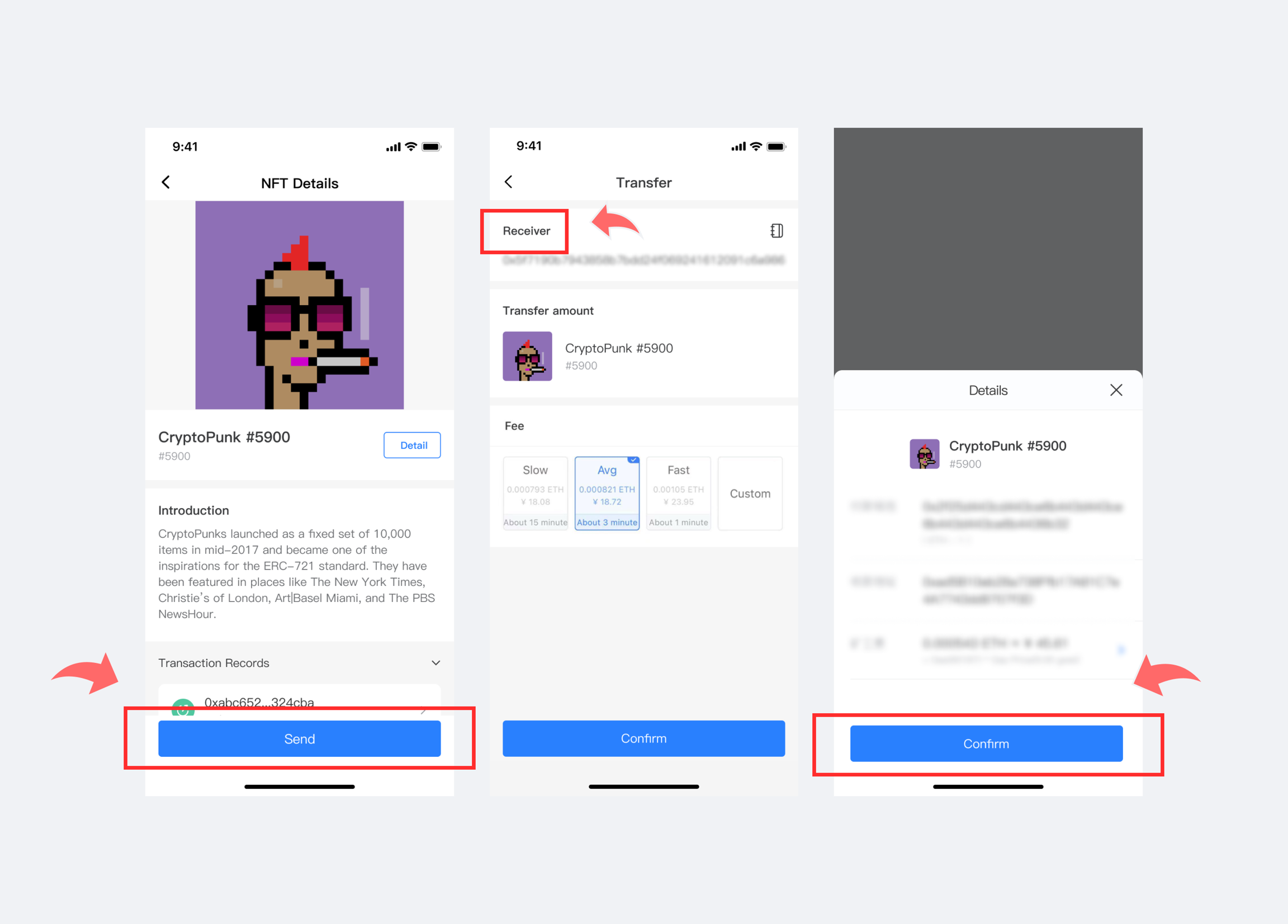 Click [Send], enter the page of [Transfer], enter the receiving address and choose the miner fee, click [Confirm] and then enter the page of [Details], confirm the receiving address again, click [Confirm]. At this point, you have finished the transaction.
