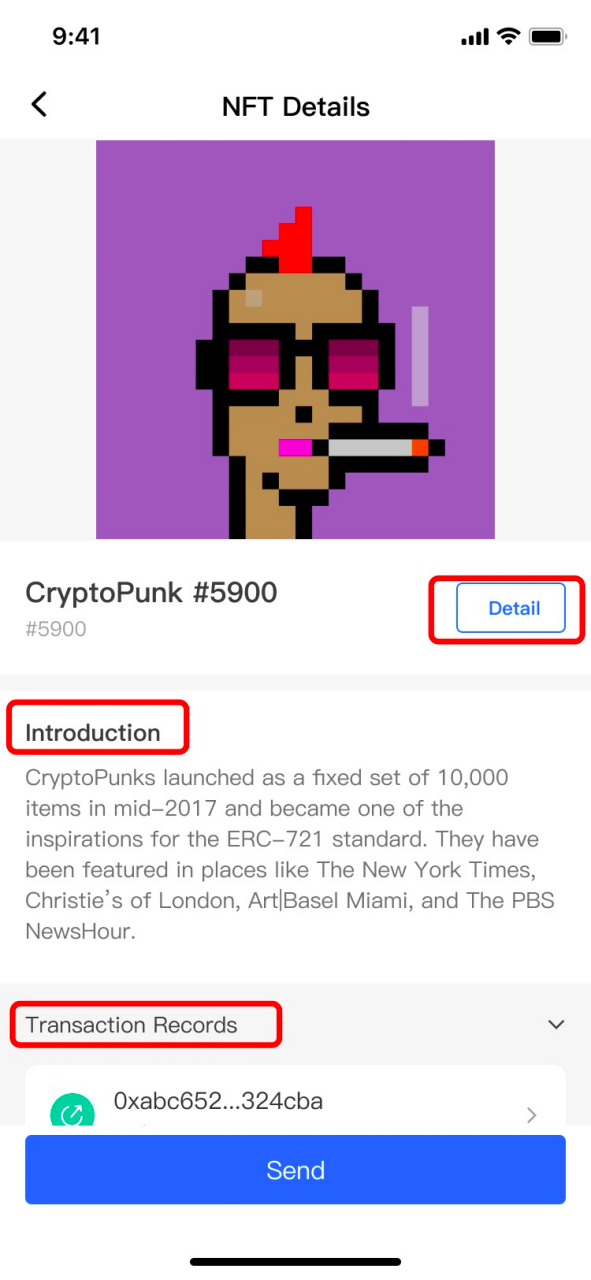 2. Click any NFT, enter the page of [NFT Details], you can know about the information and transaction records of this NFT on this page;