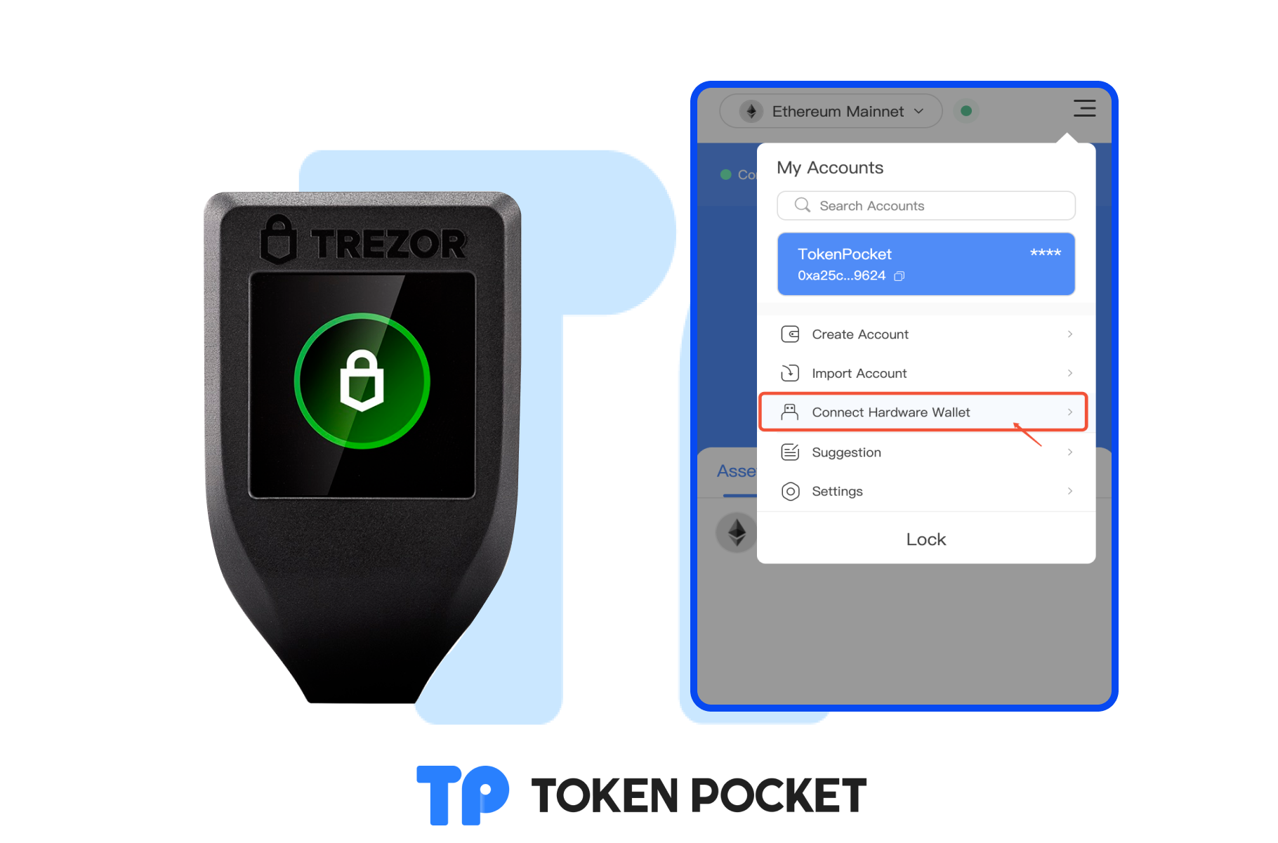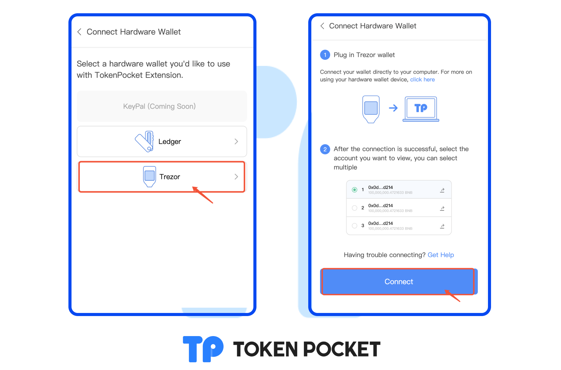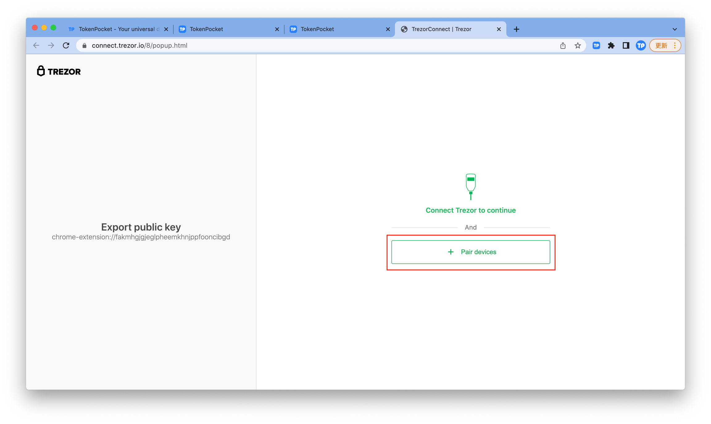 TokenPocket extension wallet (1.1.3) has already supported users to connect Trezor hardware wallet. There are two ways to connect to the Trezor hardware wallet.