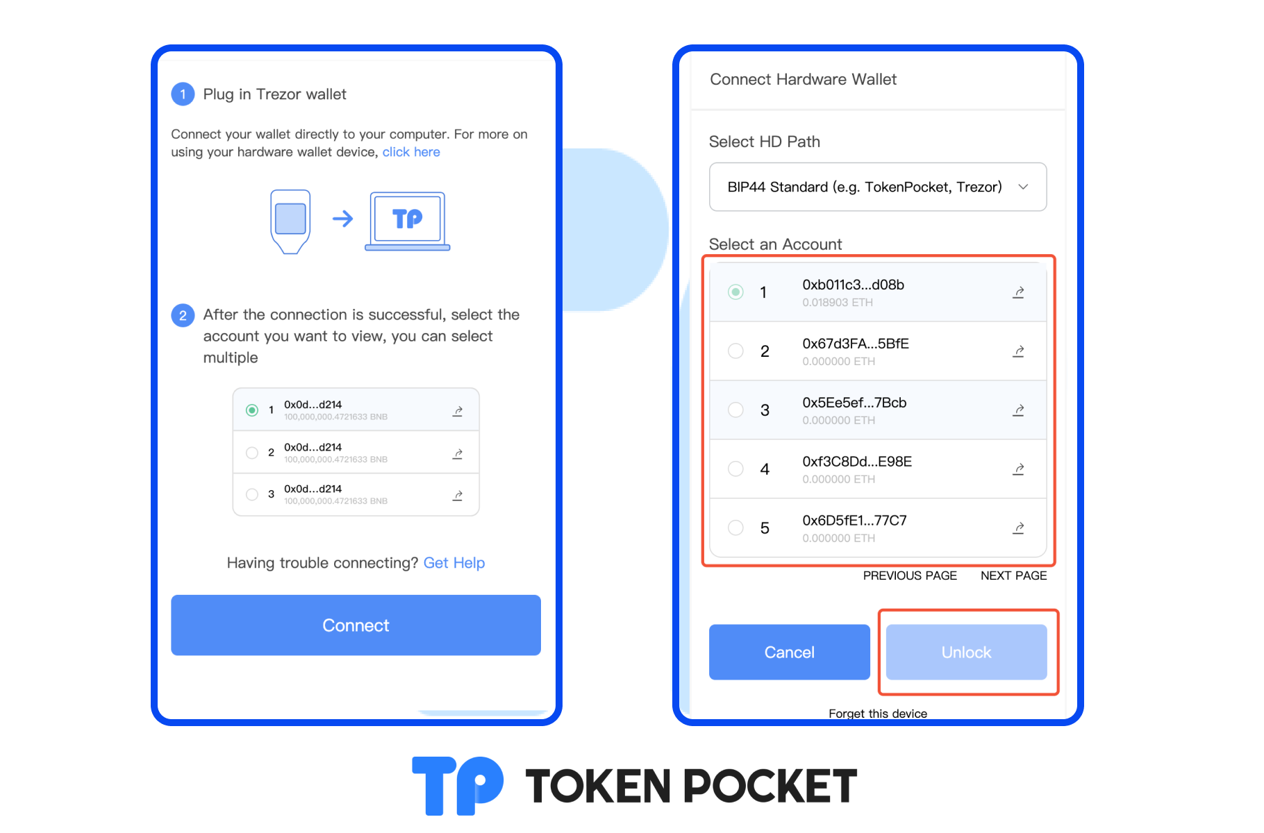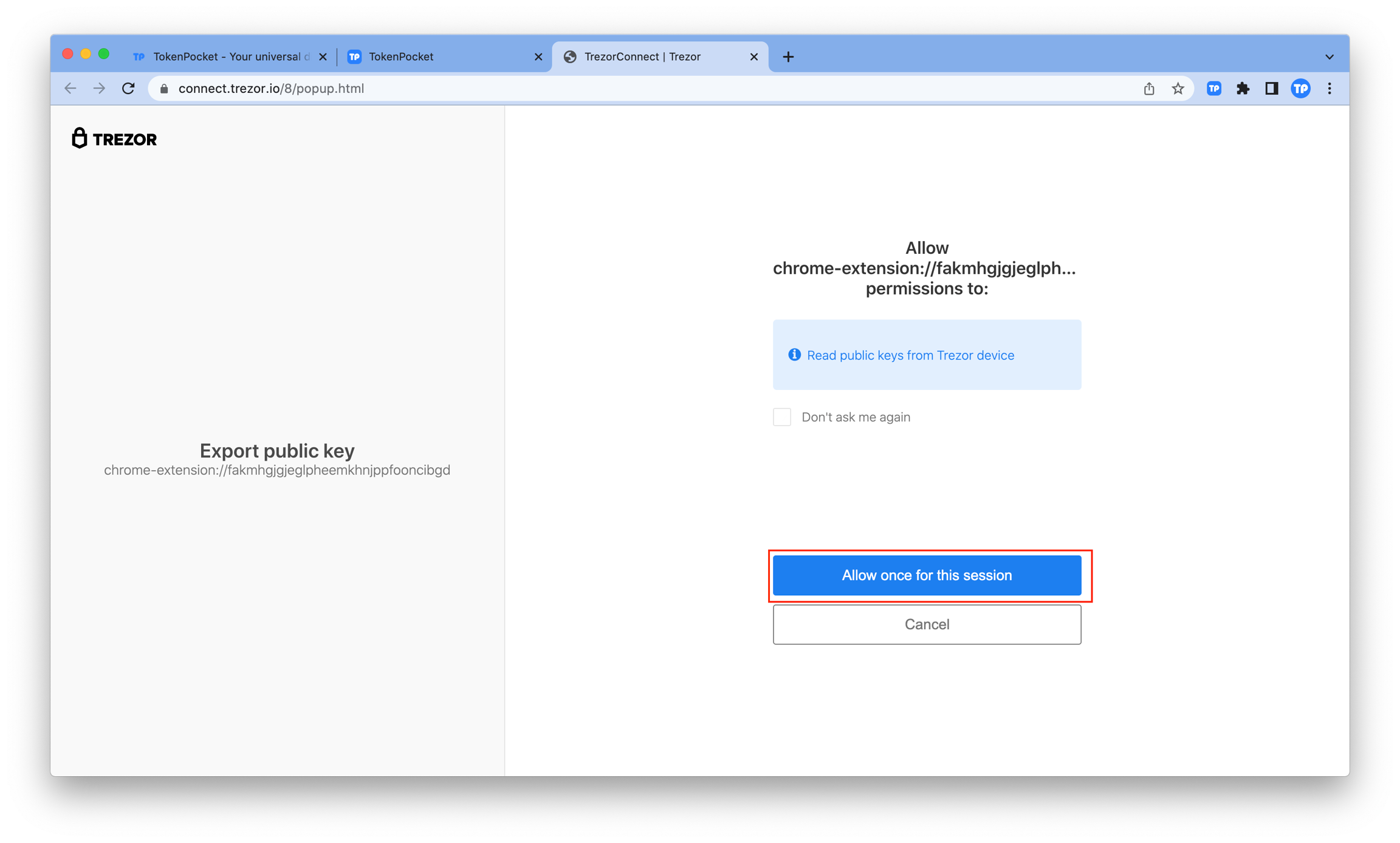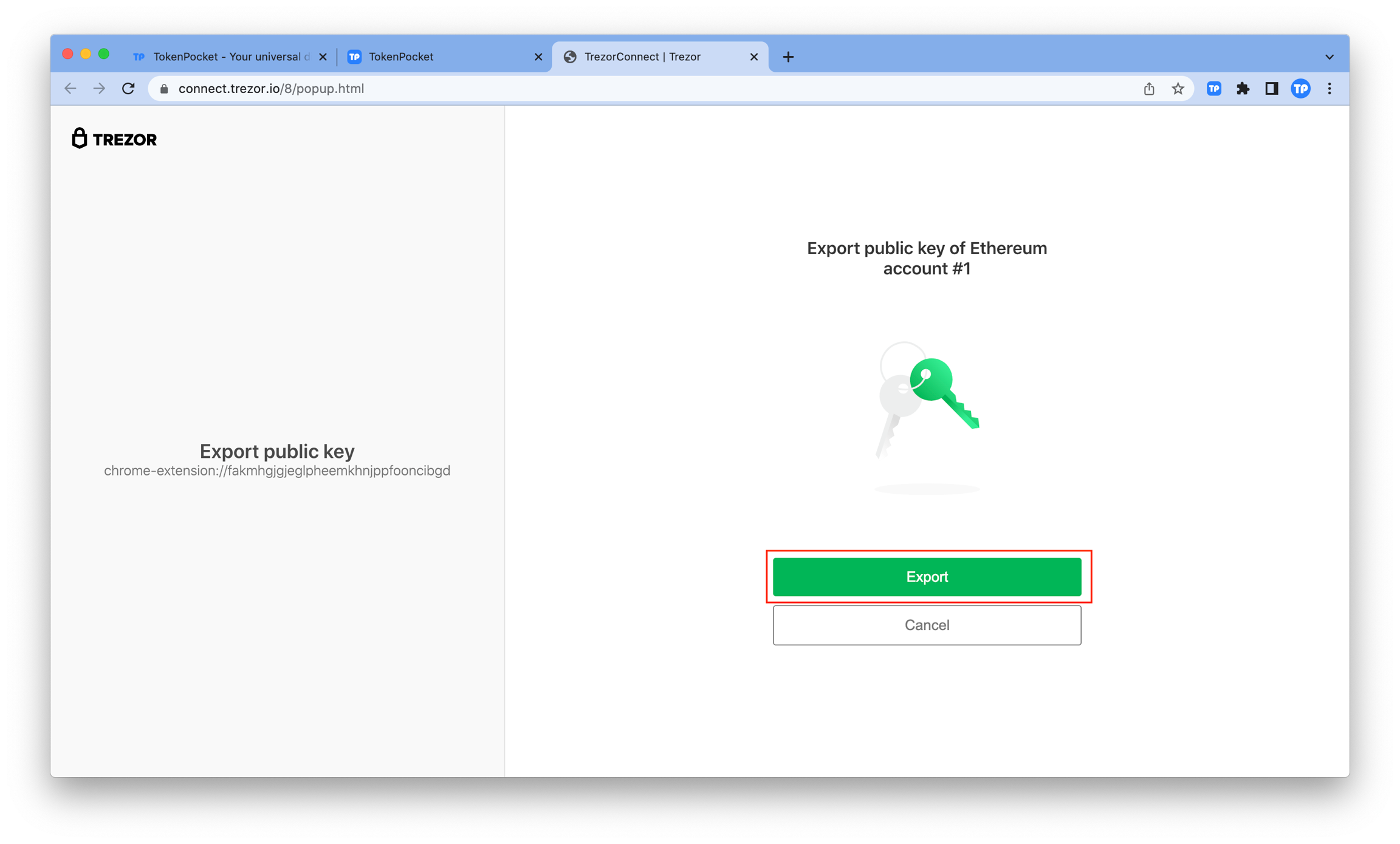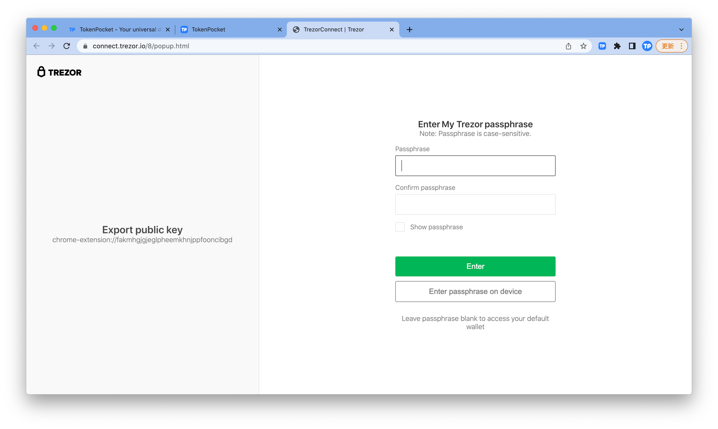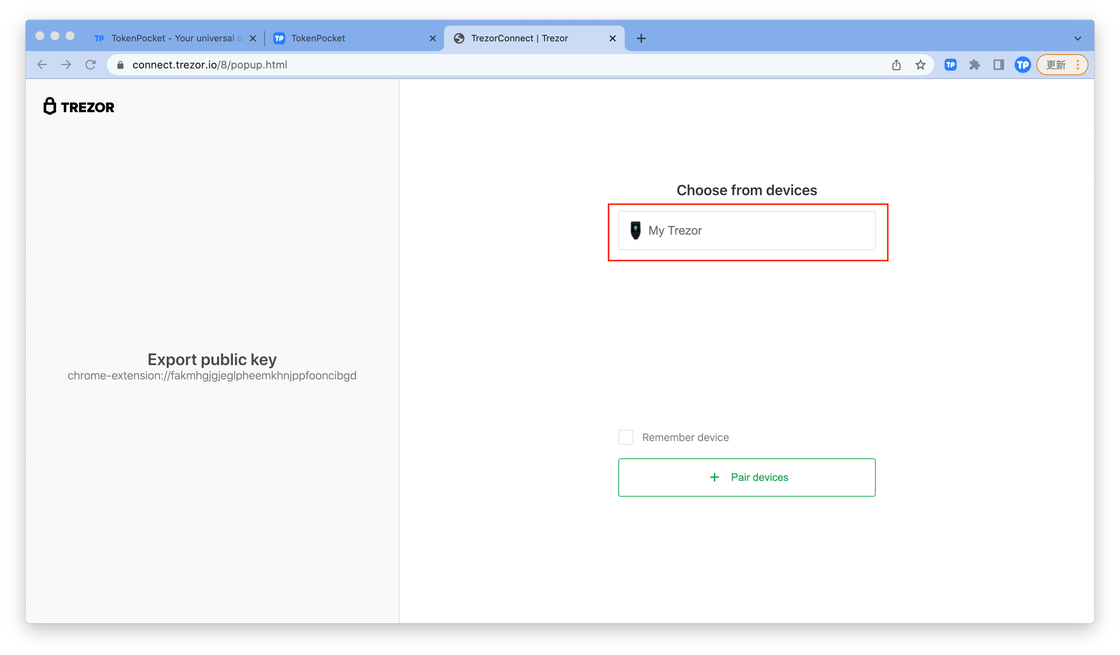 9. At this point, you have successfully connected your Trezor to the TokenPocket extension wallet.