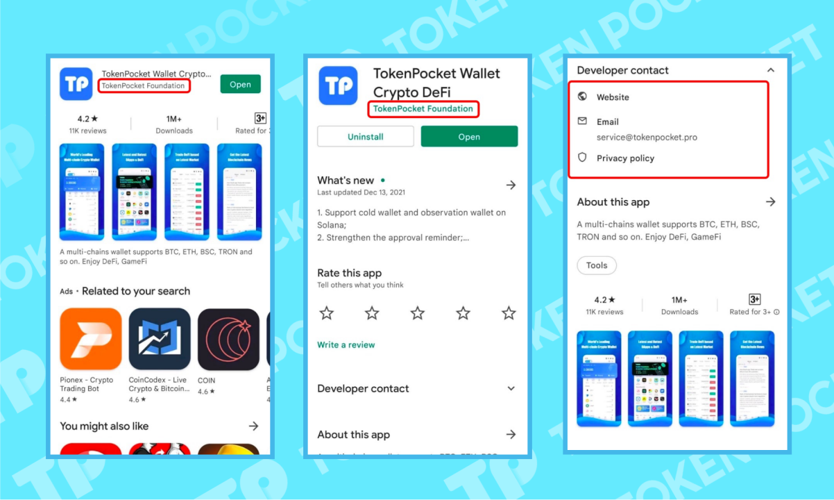 Open and log in to your Google Play. Search “TokenPocket” and see the results. You can see [TokenPocket Foundation] in the interface. Click [Development contact], you can see the website, email, and privacy policy of TokenPocket, click [Website] and you can enter the official website of TokenPocket [https://tokenpocket.pro/] or [tpwallet.io] , then it is the right “TokenPocket”.