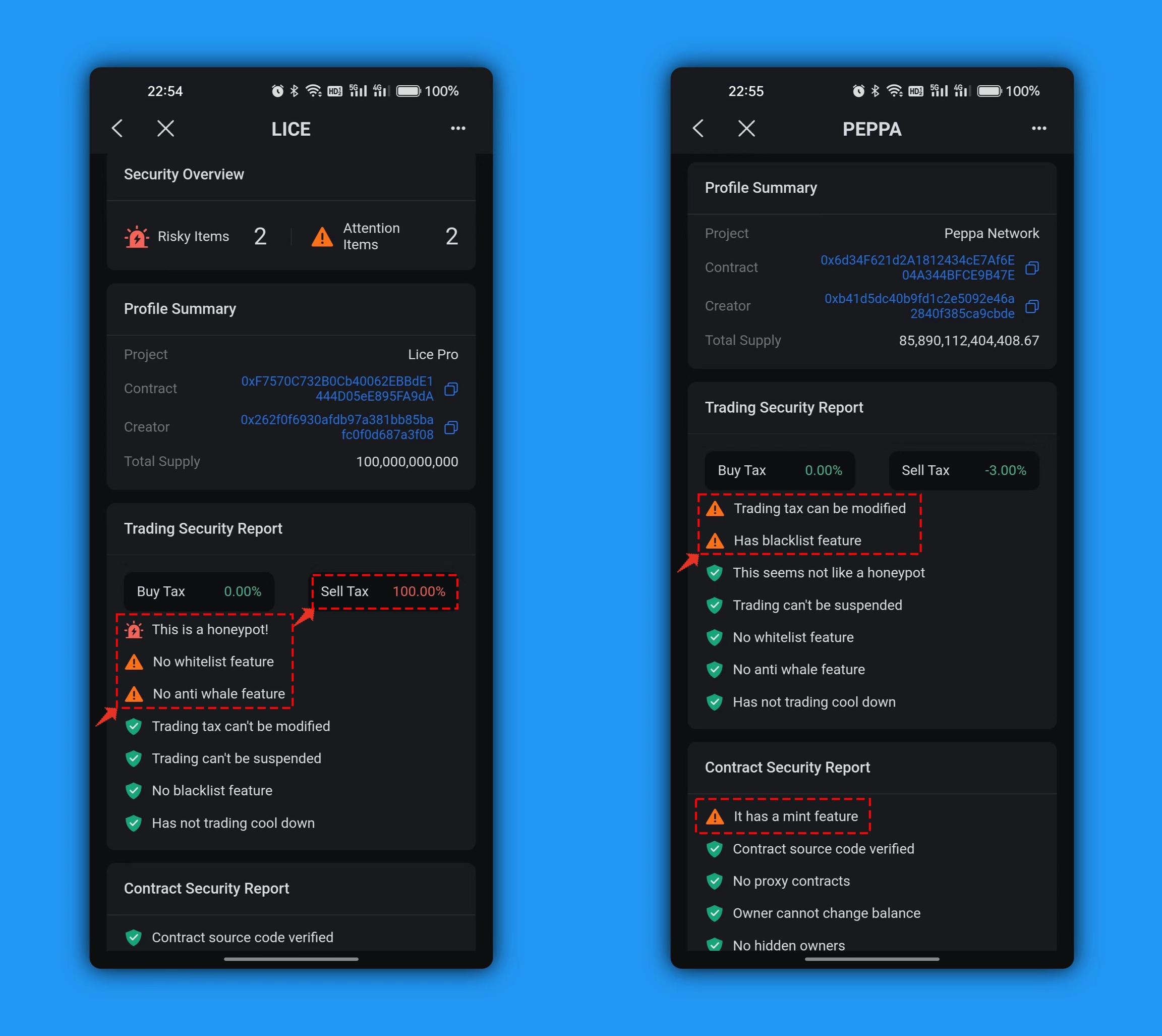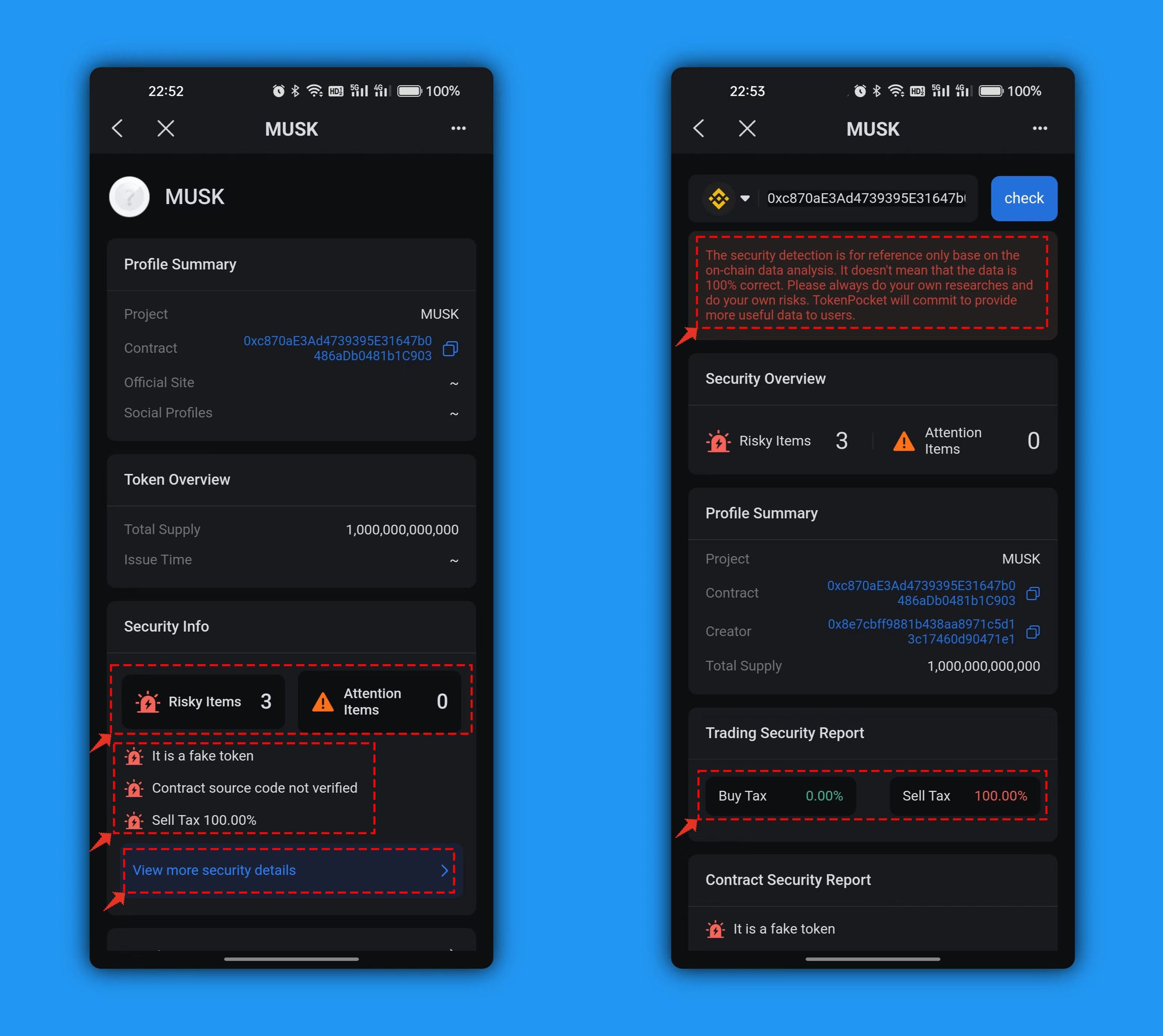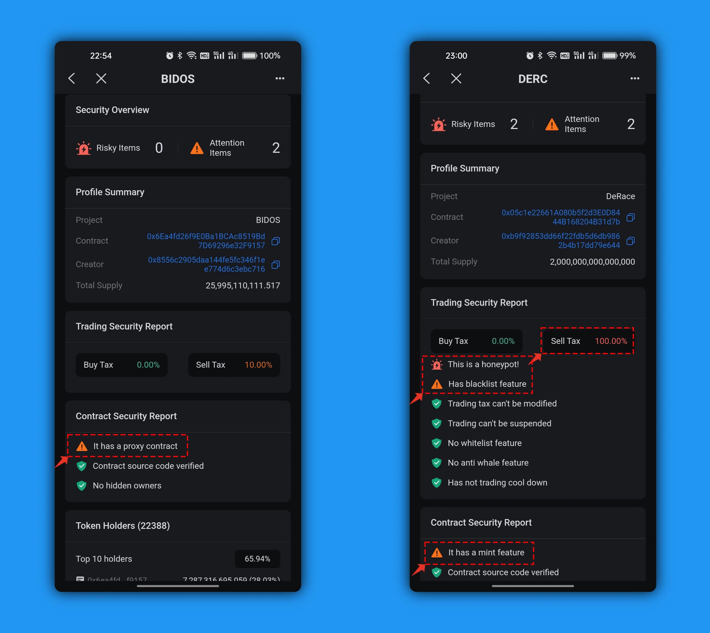 Token trading through DEX is an often-used function in our daily life. Because of the openness of DEX, any person or team can list different types of tokens. In this process, some criminals will play tricks in the token contract, for example, issue tokens unable to be sold(honeypot) and tokens with additional issuance functions. So, it is necessary to use the token contract security detection tool. Although the detection cannot be guaranteed to be 100% accurate, it can eliminate some risks and allow users to choose safer tokens for transactions.