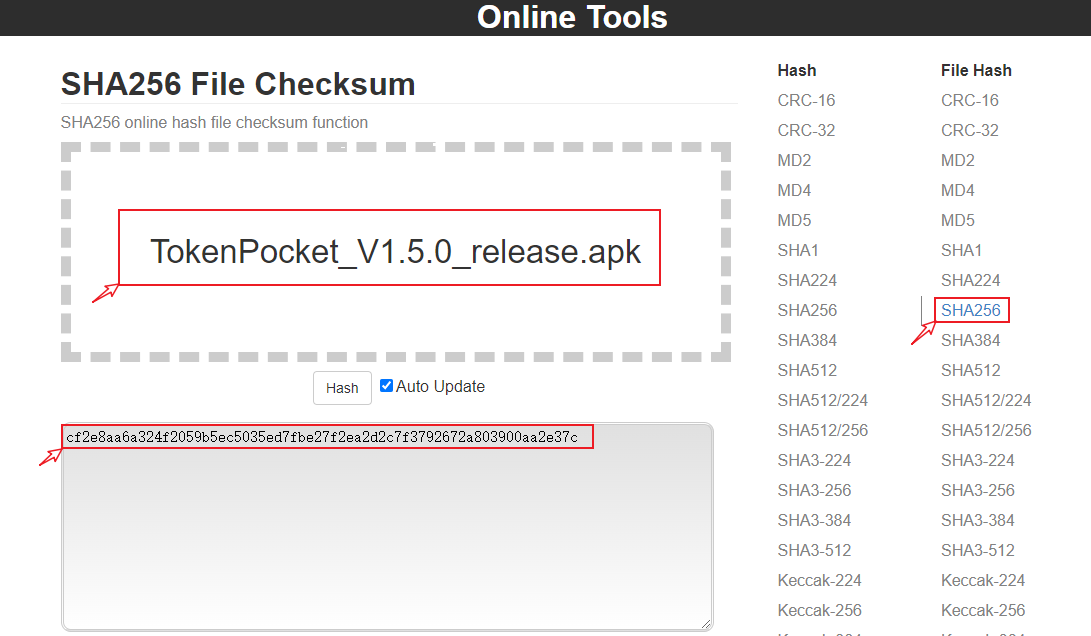 There are many tools for online verification of MD5\SHA256 value, and their usage is similar. You only need to drag or load the apk file downloaded to the PC into the verification platform to wait for the result. The obtained result can be verified by comparing it with the MD5 or SHA256 value of the genuine APP published on the official website of TokenPocket(There may be advertisements and other content in the online tool page, please use the main verification function, and do not recommend anything else).