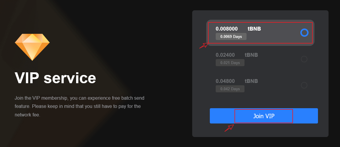 2、The multi-chain token batch sender supports VIP services. Click “Join VIP” on the homepage, and choose 1-day, 7-day and 31-day services according to your actual needs. The fee of each service varies from period.