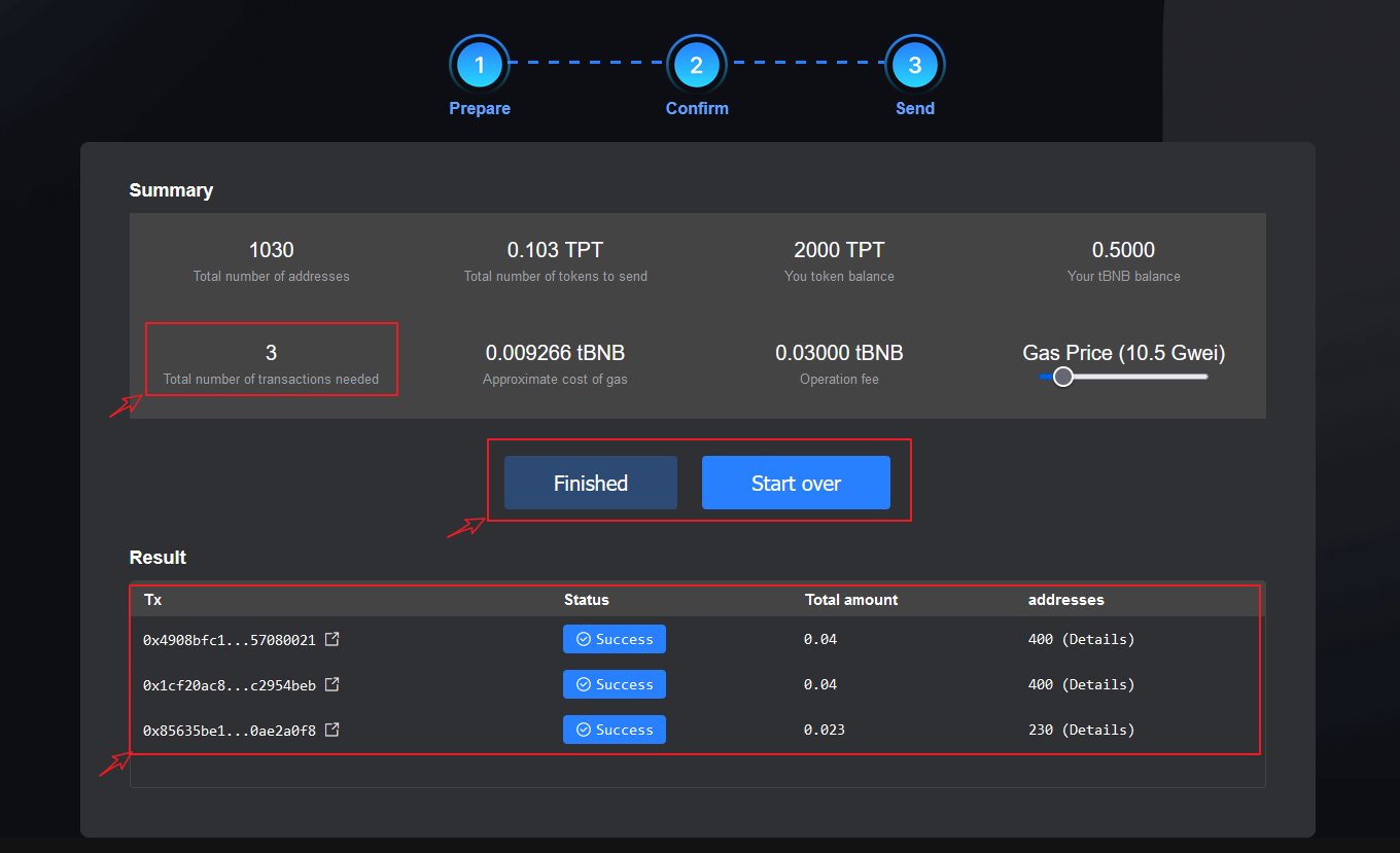 click “confirm” to call the TokenPocket extension wallet for approval, and it will be sent in a group of 400 addresses (this parameter will vary from tokens or public chains). After three confirmations, all the steps of the batch operation are completed.