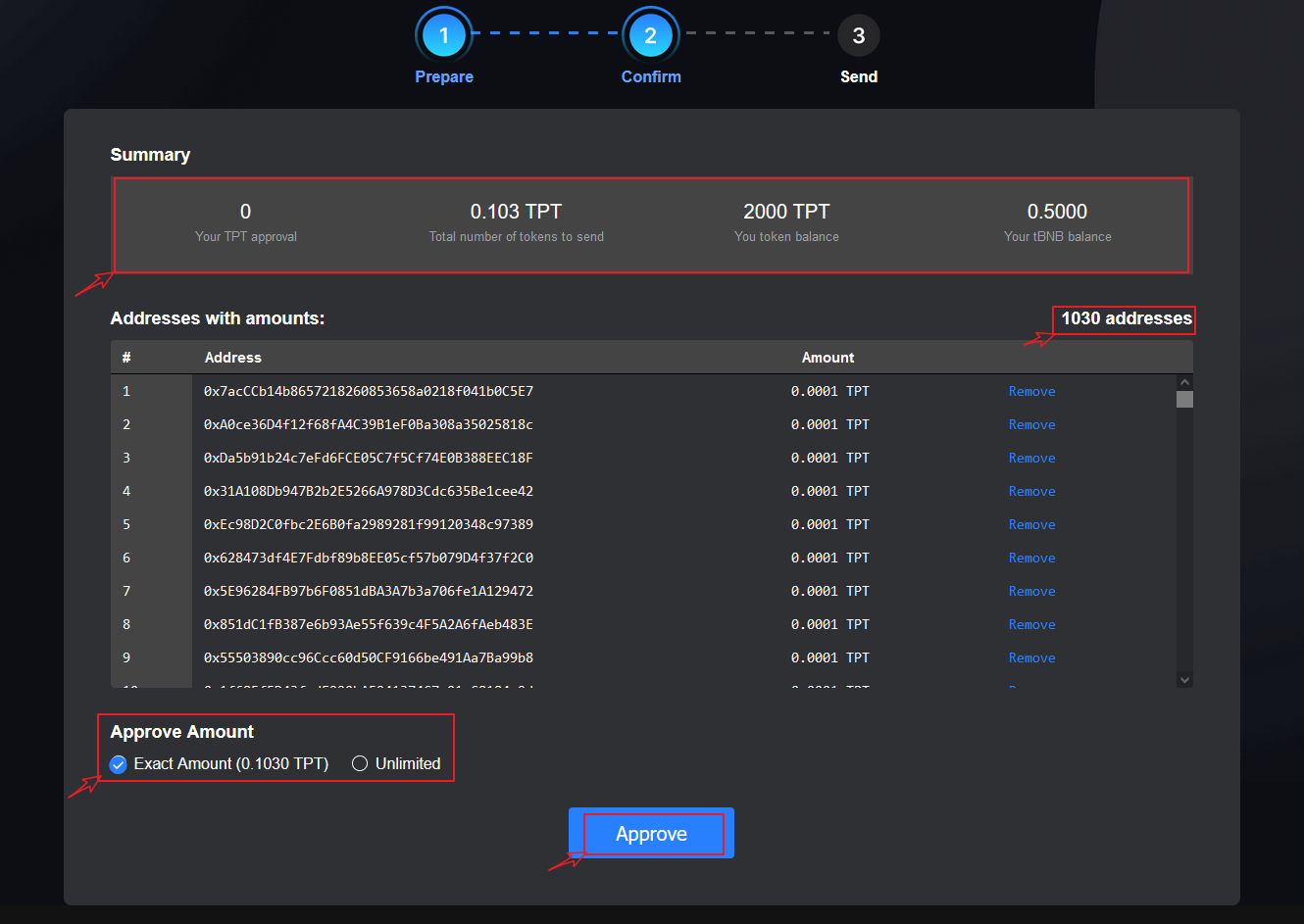 It should be noted that the addresses imported in batches will be allocated and sent in groups of 400 (the number may vary from public chains or tokens), so users can optimize according to this feature when setting addresses, and try not to waste gas fees.