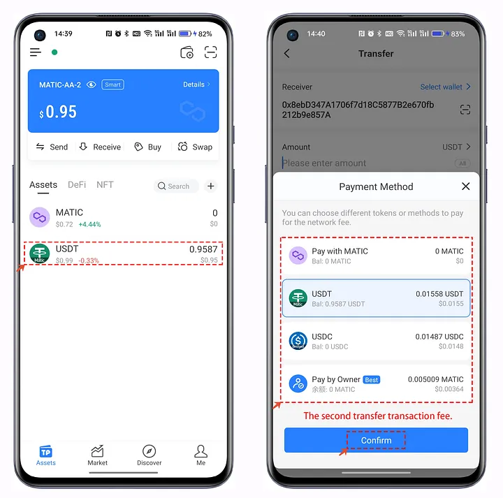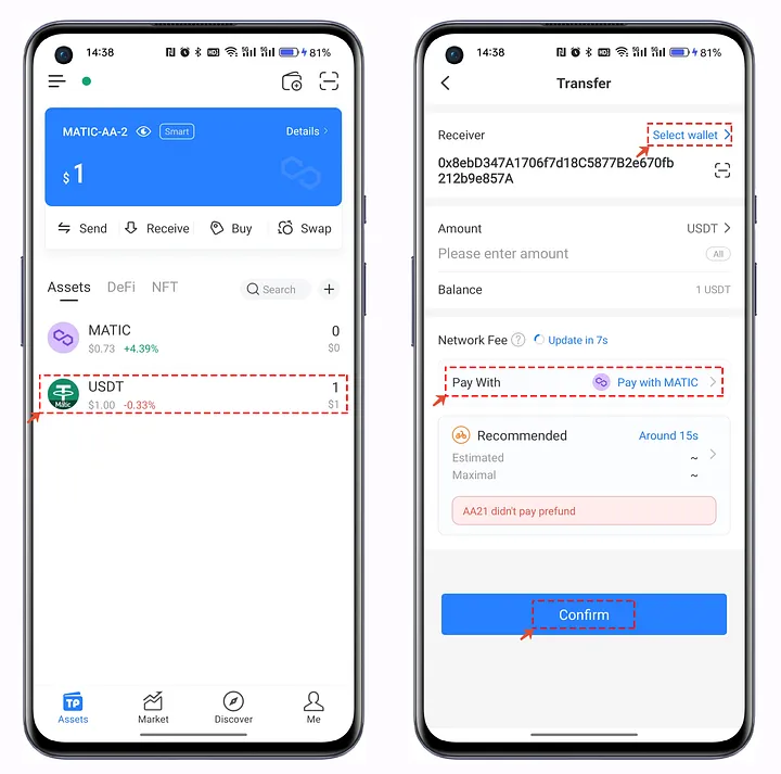 1. Open your TokenPocket AA Wallet, we’ve transferred 1 USDT for test in this situation. Click USDT to execute the transfer operation, and enter the receiving address. You can view the [Pay With] account and select the pay method.