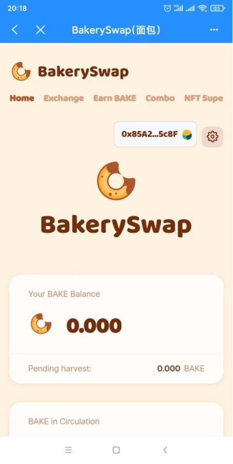 2. The home page of BakerySwap illustrate lots of useful information such as BAKE balance,supply of BAKE circulation and total supply as well as burned token. On the top of meun, users can see there are four buttons which are 【Exchange】,【Earn BAKE】,【Combo】 and 【NFT Supe】respectively.