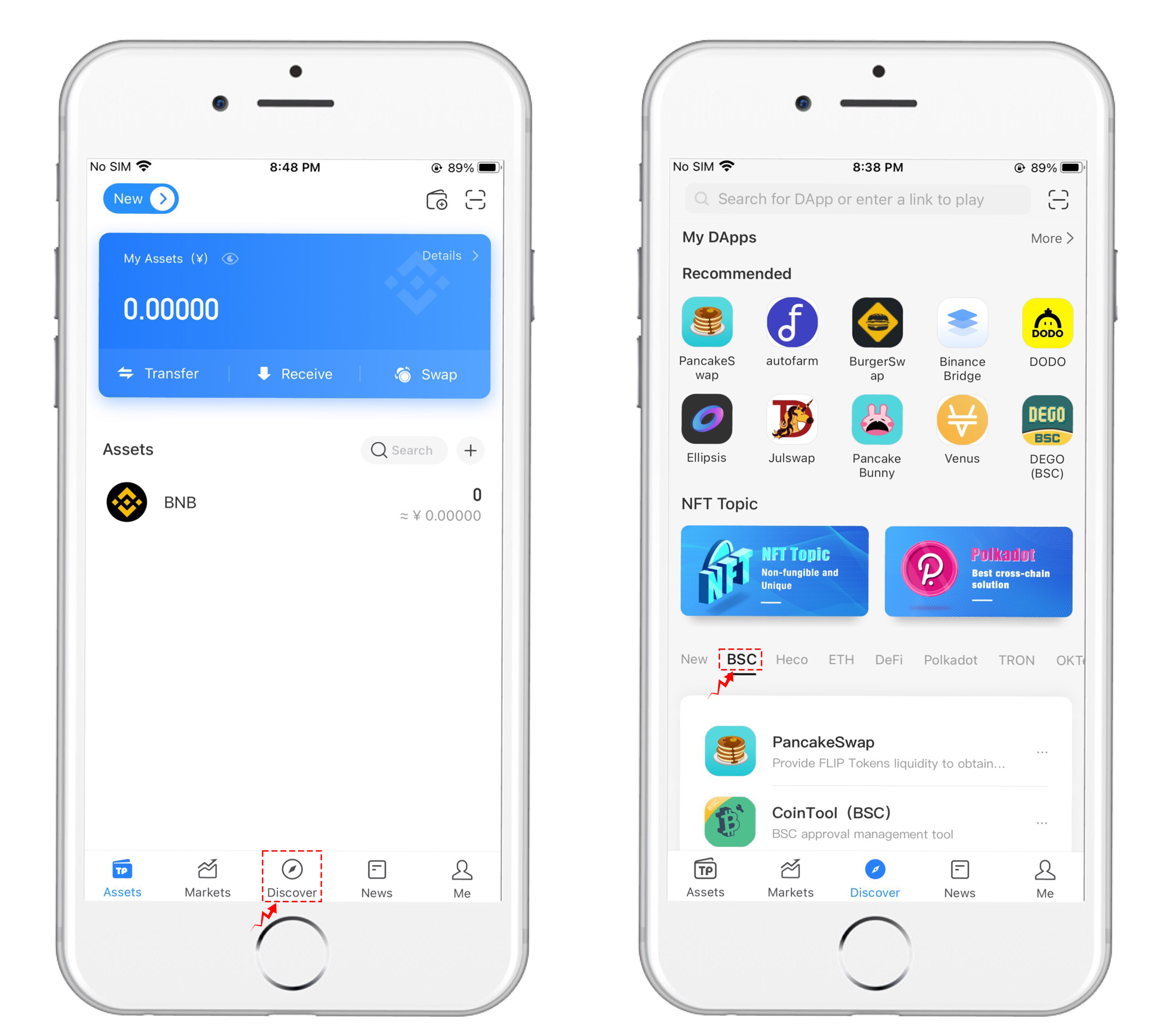 4、 After the Verification mnemonic is completed, you have successfully registered. Click the "Discover" menu at the bottom, and then you can enter DAPP, where you can use Binance Smart Chain's DAPP. (For new users or Regular users who want to import the wallet, you can click the first option in the upper right corner to enter.