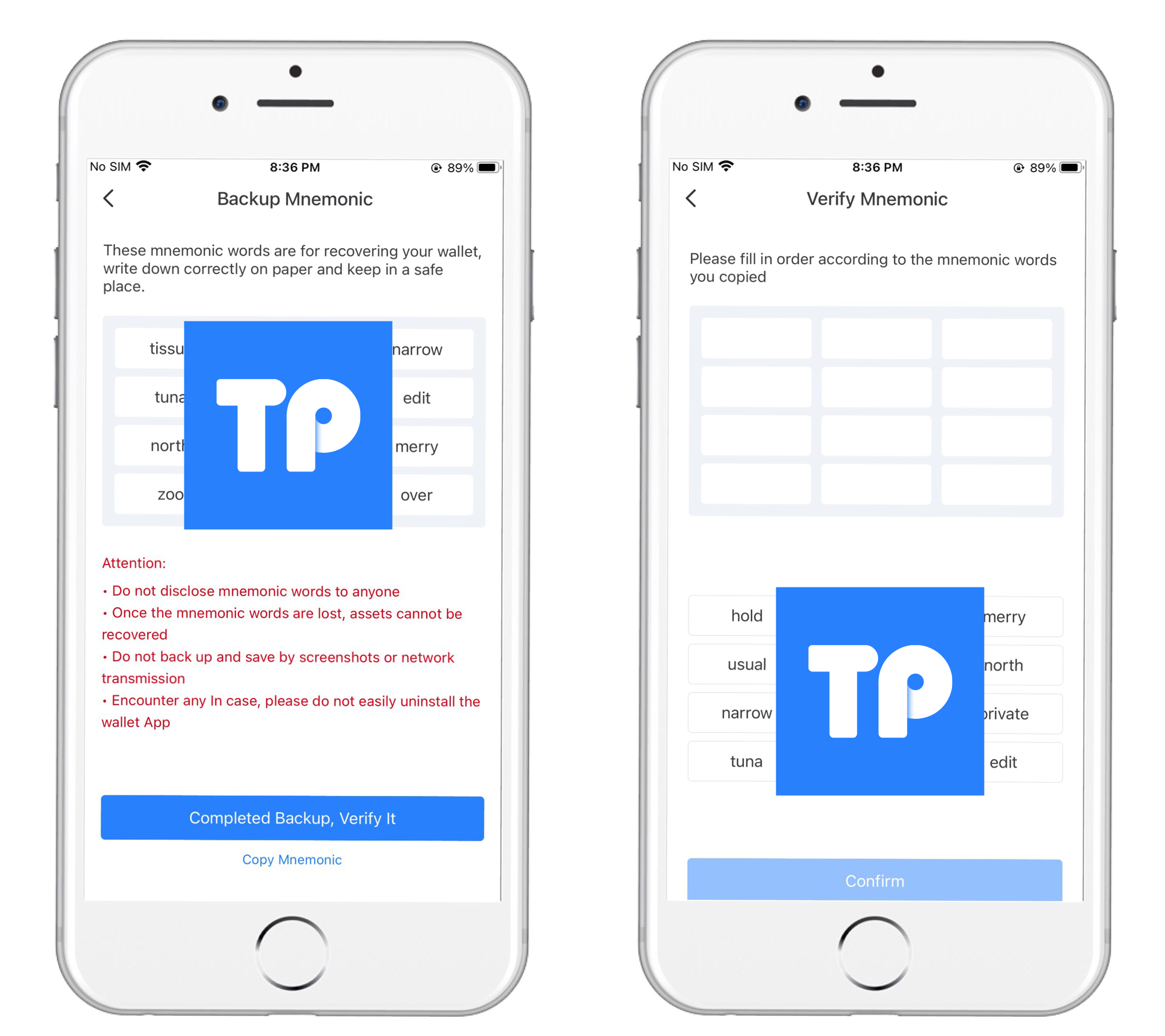 3、 The interface of "Backup Mnemonic" requires us to correctly record the mnemonic words according to the provided words and order. After confirming the record, click "Completed backup, verify it" to complete the verification of the mnemonic words in the correct order.