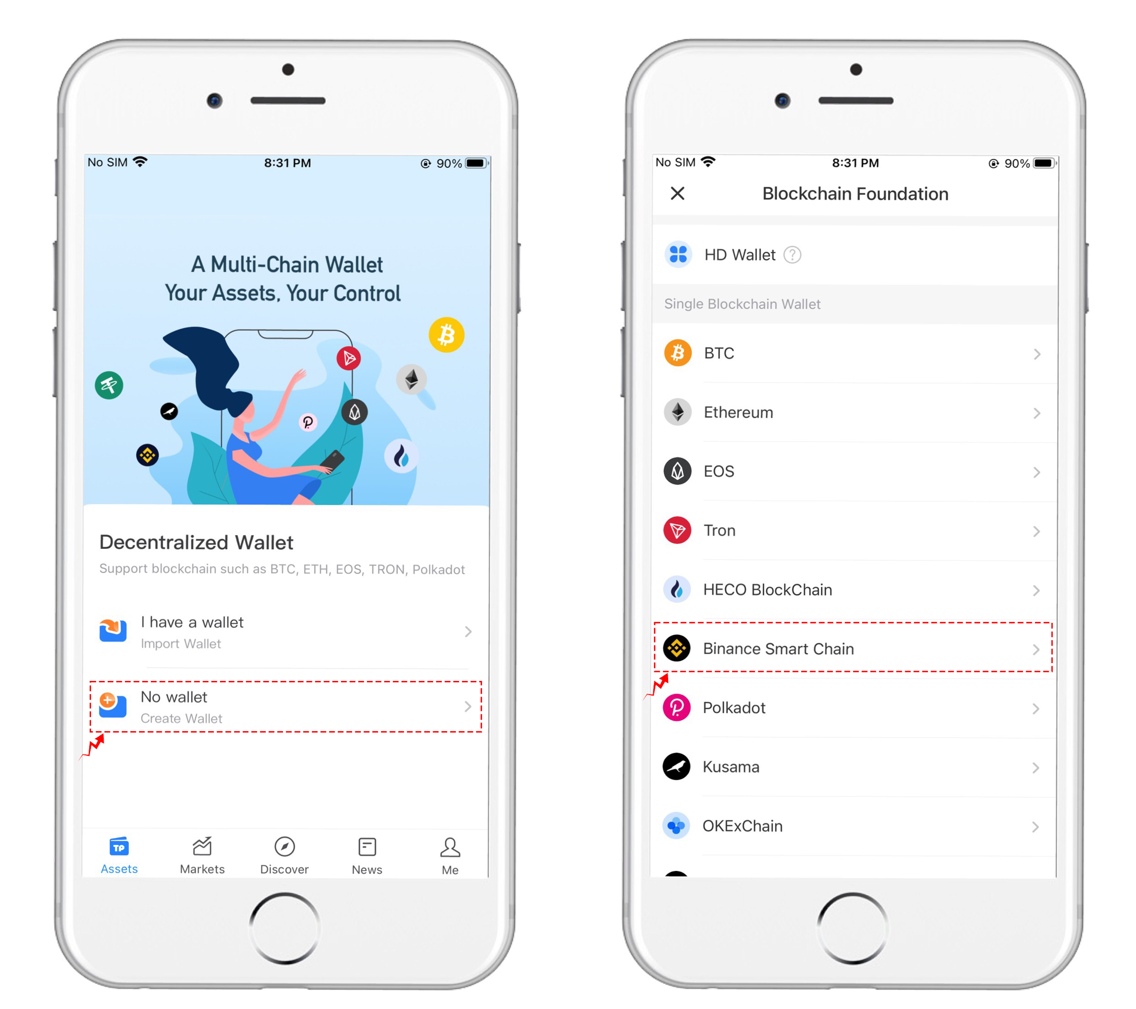 1、 Download the TokenPocket wallet, install it and open it. Clicks "No wallet" and selects "Binance Smart Chain" to enter the creation interface.