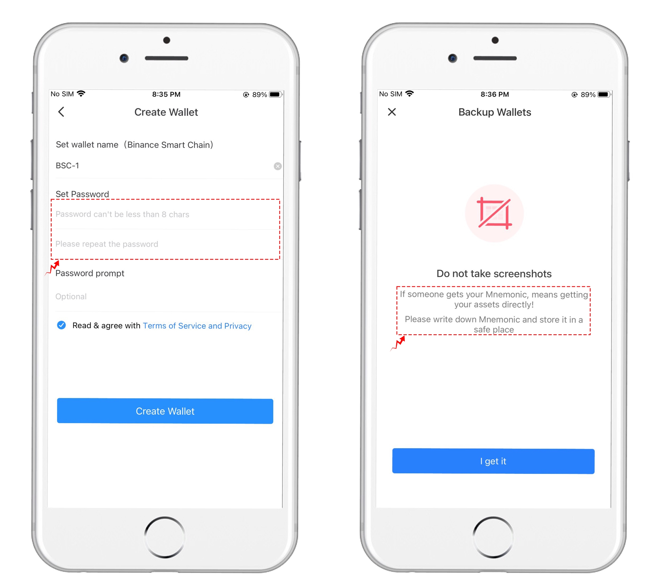 2、 Set “Wallet Name” “Password” and click "Create Wallet" to enter the prompt interface of "Backup Wallets". Please read the notes carefully.