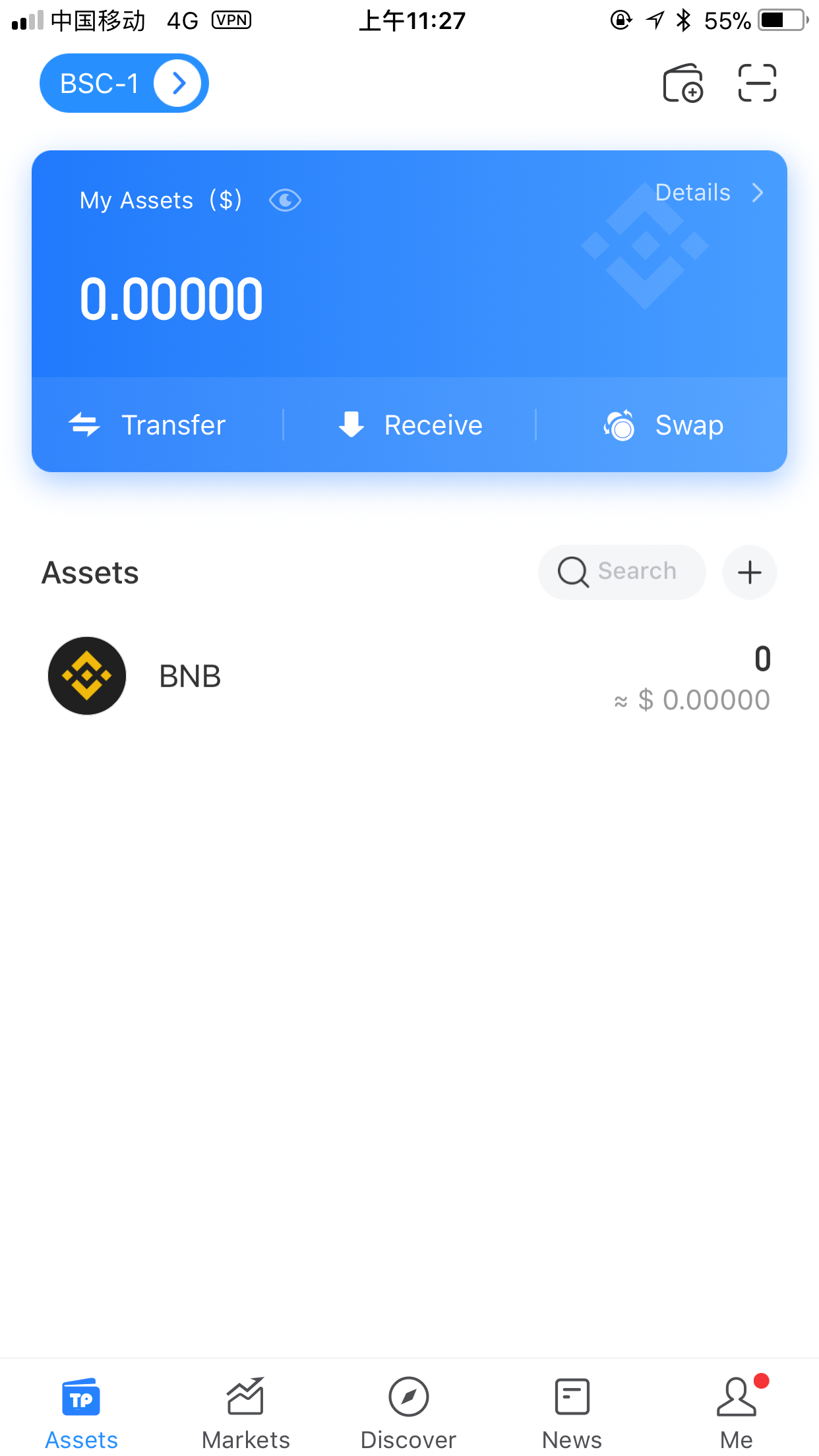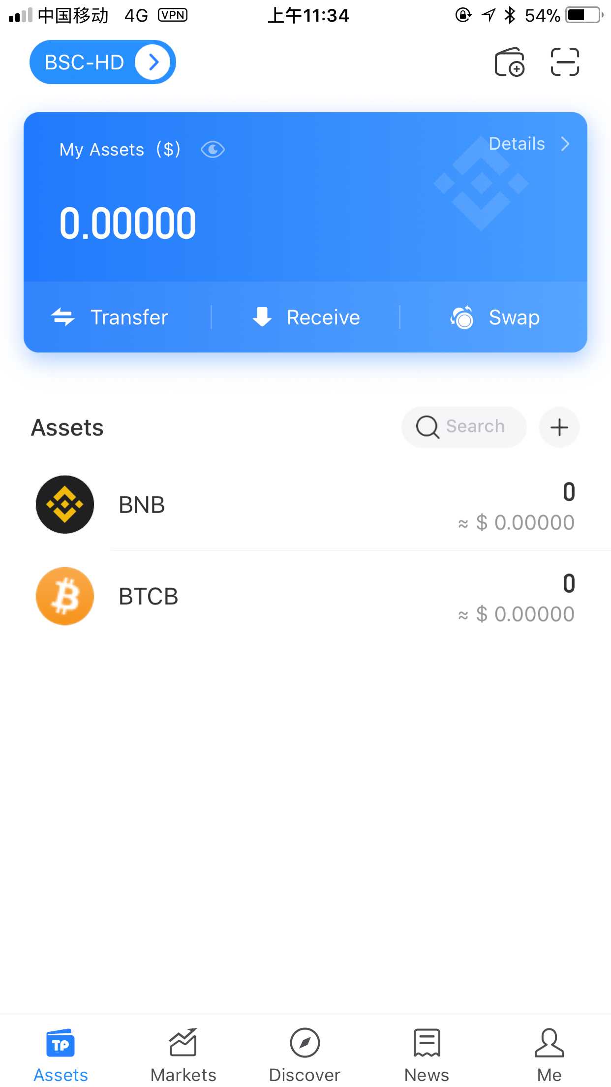 After the wallet is created, click Receipt to be the receiving address of the Binance Smart Chain. Fill in the address when withdrawing BTC on the Binance Exchange. The main network selects the second BSC Smart Chain.