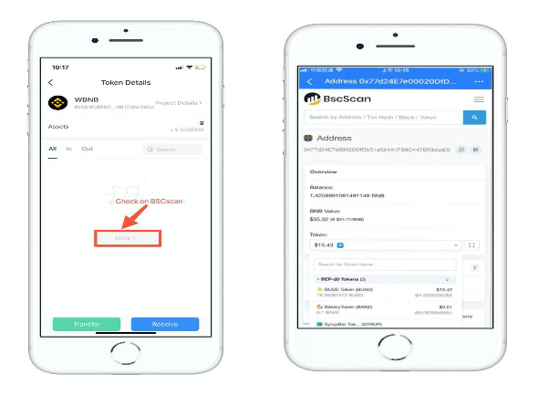 4. The transaction records on BSC cannot be displayed now, the recent version will be updated to support it. Users can click【More】to check through the block browser (https://bscscan.com/).