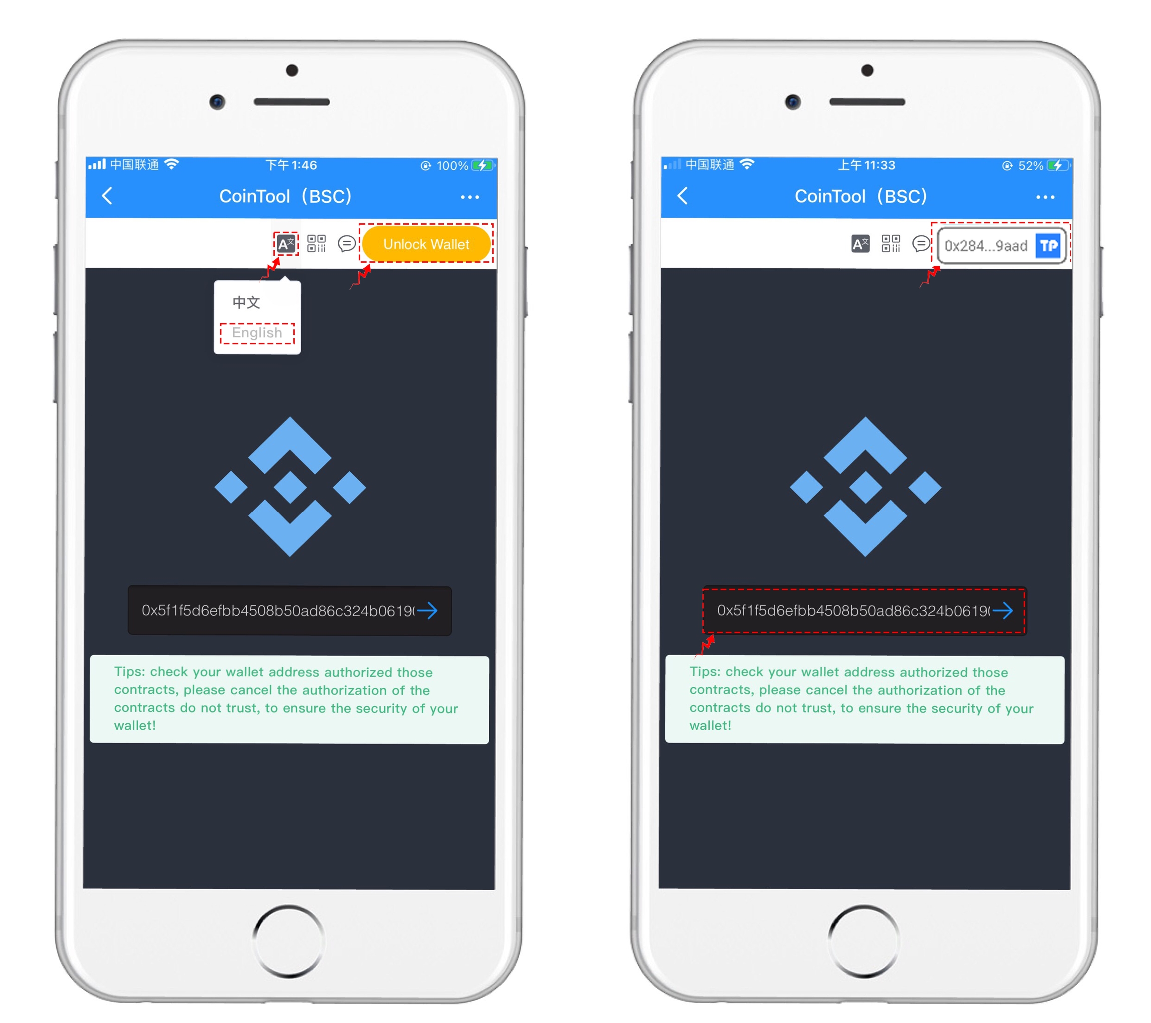 2. When open the DApp at the first time, you will need to [Unlock Wallet], here you only need to click to unlock the wallet to automatically connect. The address of the search window will open the DApp wallet address by default, and click the "→" arrow to scan the authorization record.