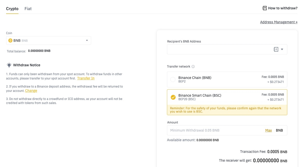 How to withdraw BNB to Binance Smart Chain