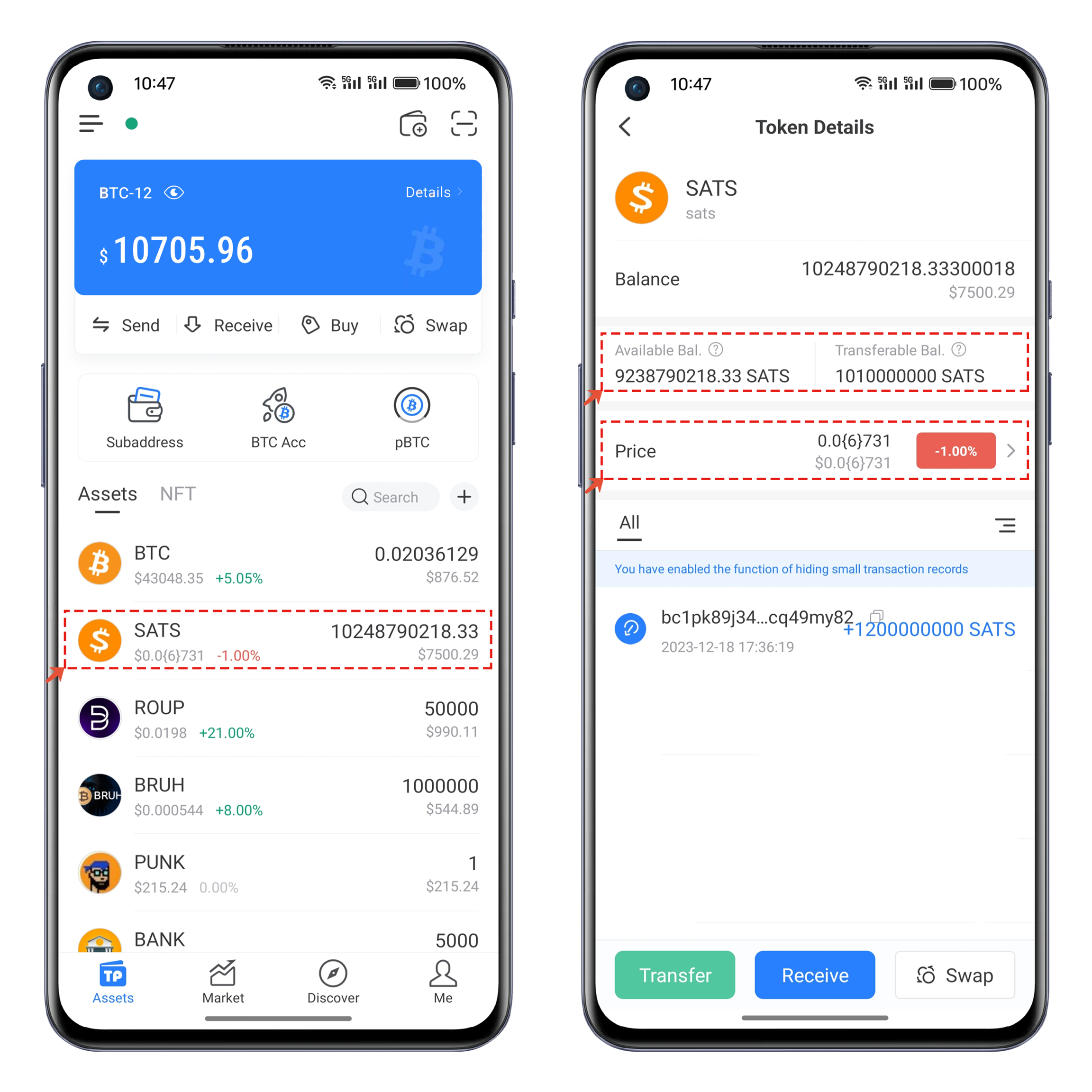 In the Android version 1.9.5, support for displaying, pricing, and transferring BRC-20 assets has been added. Simply click on the asset you want to transfer, and in the details, you will find information such as "Available Balance," "Transferable Balance," "Market Price," and more.