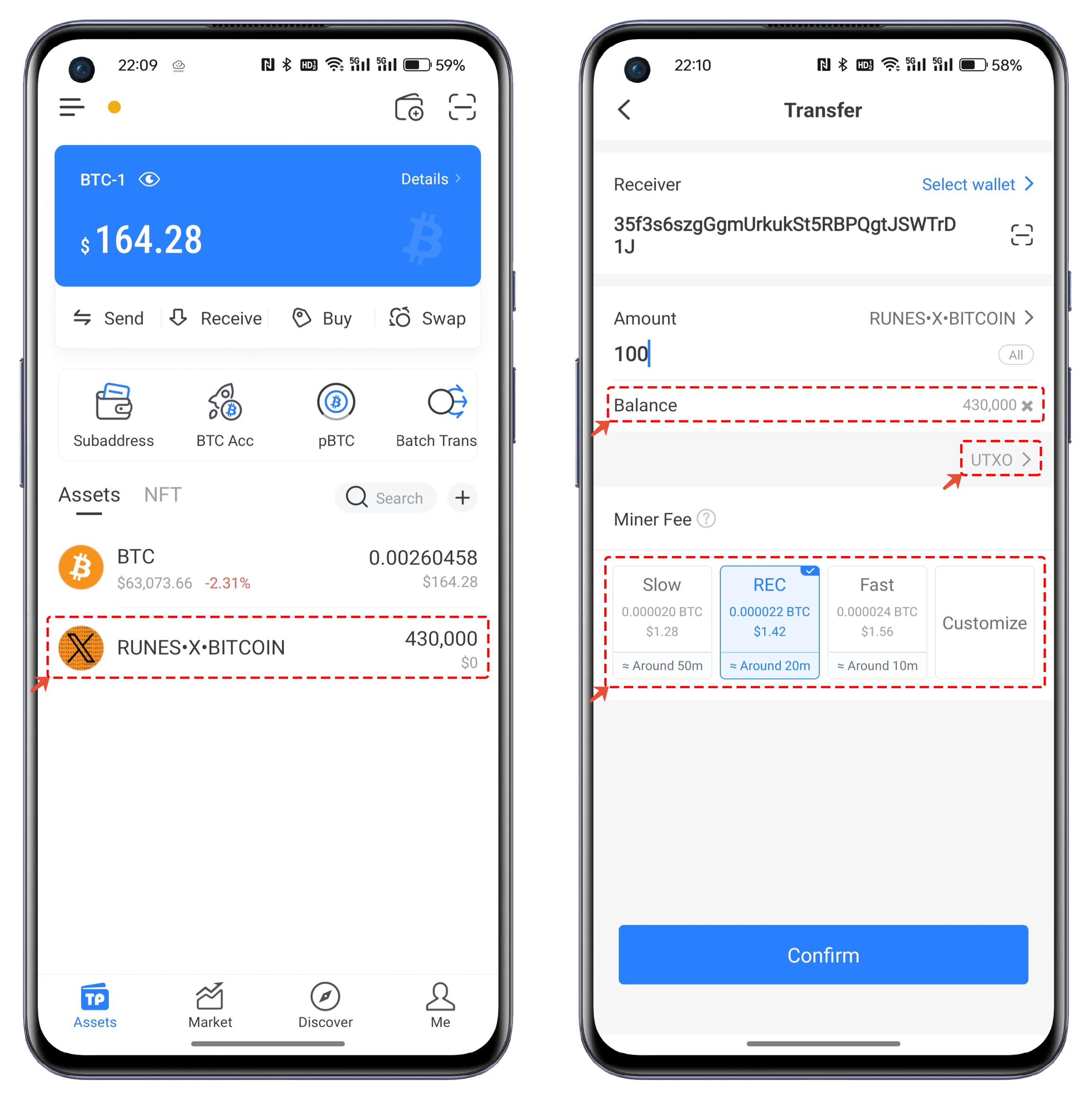 Open TokenPocket, click on the purchased RUNES•X•BITCOIN asset, and enter the transfer interface. Set the recipient address and the amount to be transferred. You can choose the miner fee according to your actual situation. If you want to transfer quickly, you can click the "Custom" function to increase the sat parameter.