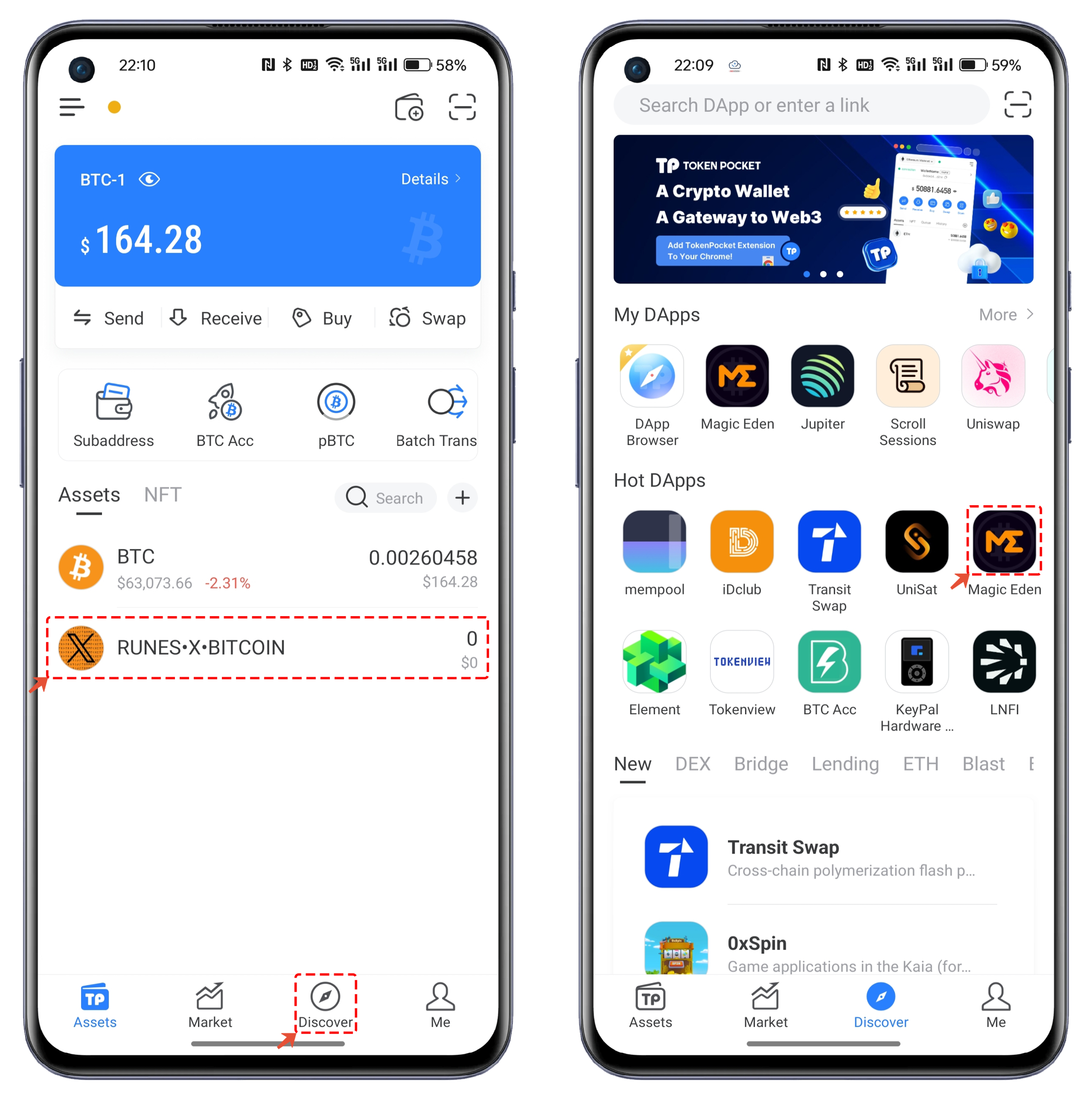 Open TokenPocket and click the "Discover" menu at the bottom. In the "Hot DApps" section, open the "Magic Eden" application.