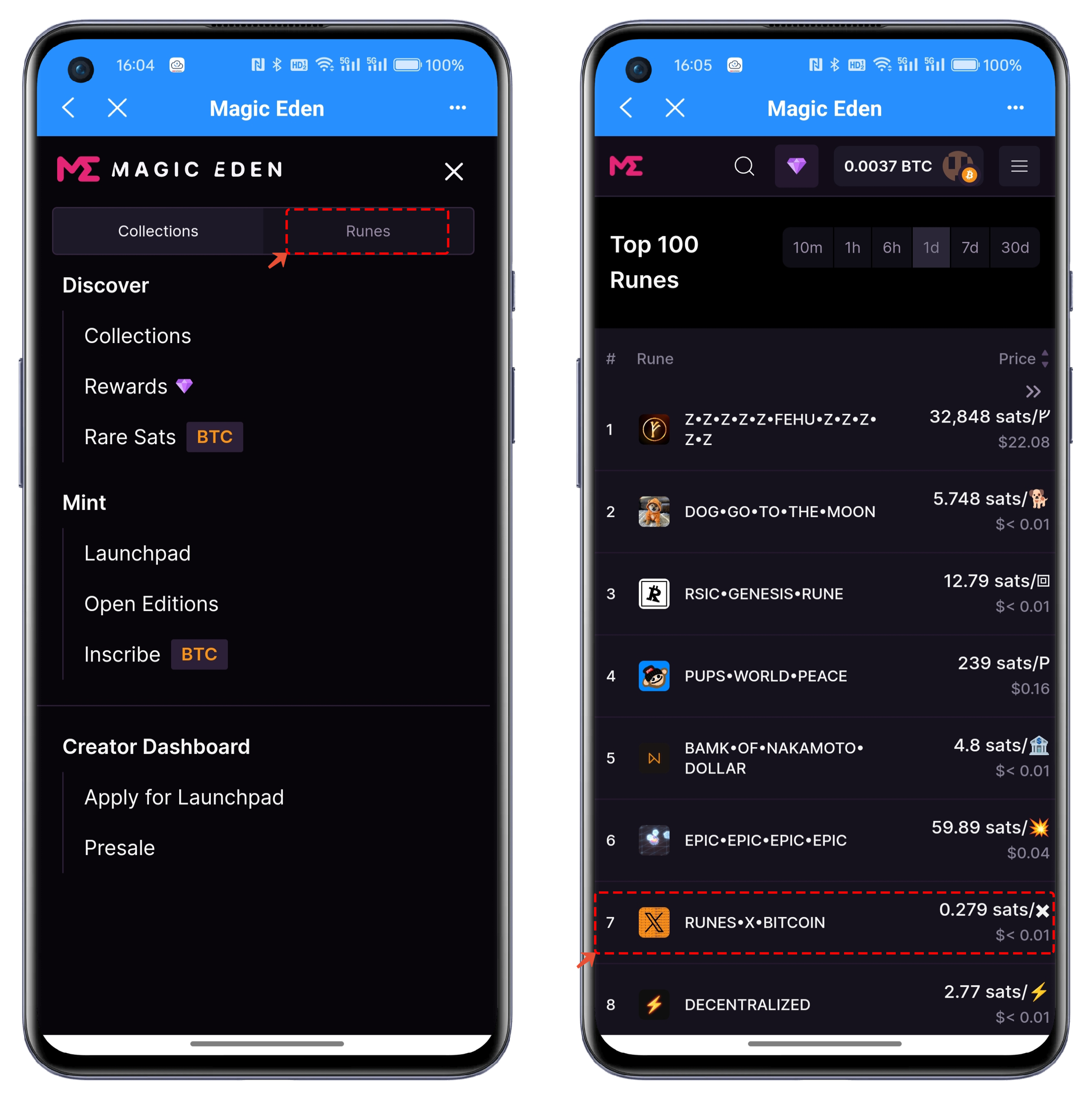 In the opened interface, select the "Runes" option. Returning to the list, you will see the trading data for Rune assets. Choose any token, for example: RUNES•X•BITCOIN.