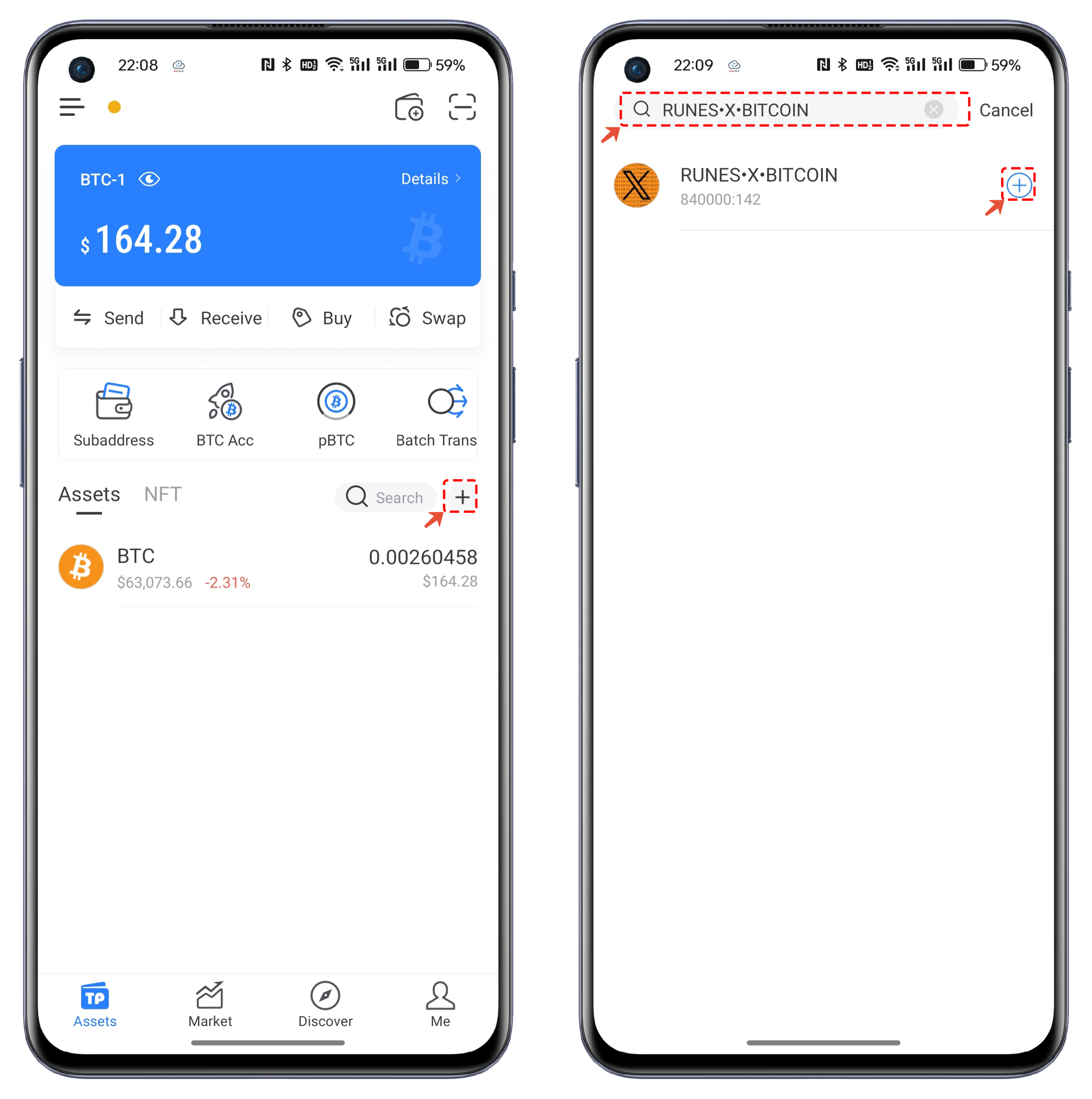 Open TokenPocket, and click the "+" on the right side of the assets. The token names for Rune are quite unique, so after entering the name of the token you need to search for, you can accurately locate the token without any duplicate names. Click "+" again to add it to the token list.