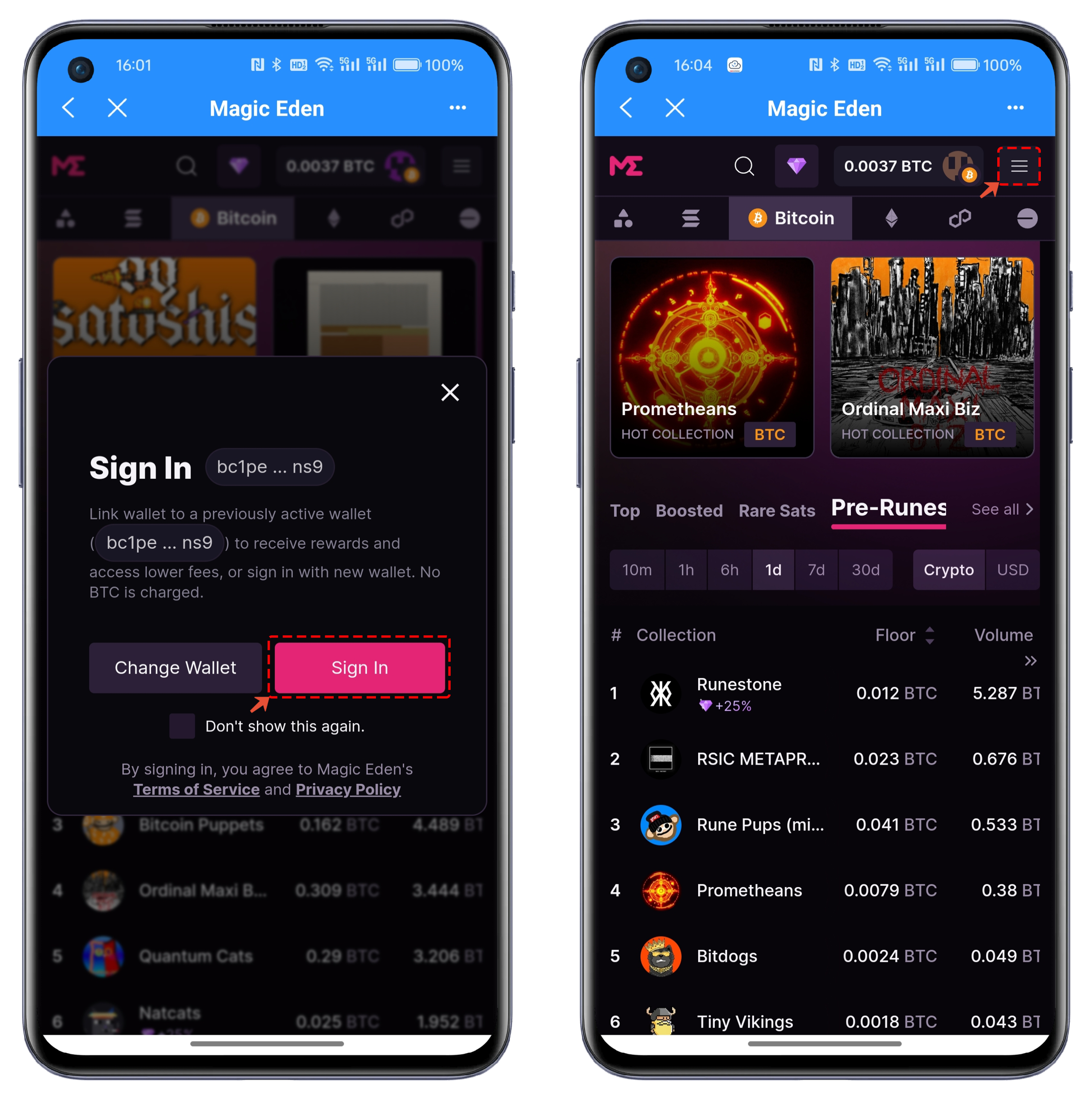 After opening Magic Eden, the wallet will connect automatically. However, you need to click "Sign In" to sign in. Once logged in, the Magic Eden interface will default to displaying the inscriptions trading list. Here, click the menu in the upper right corner of the interface.