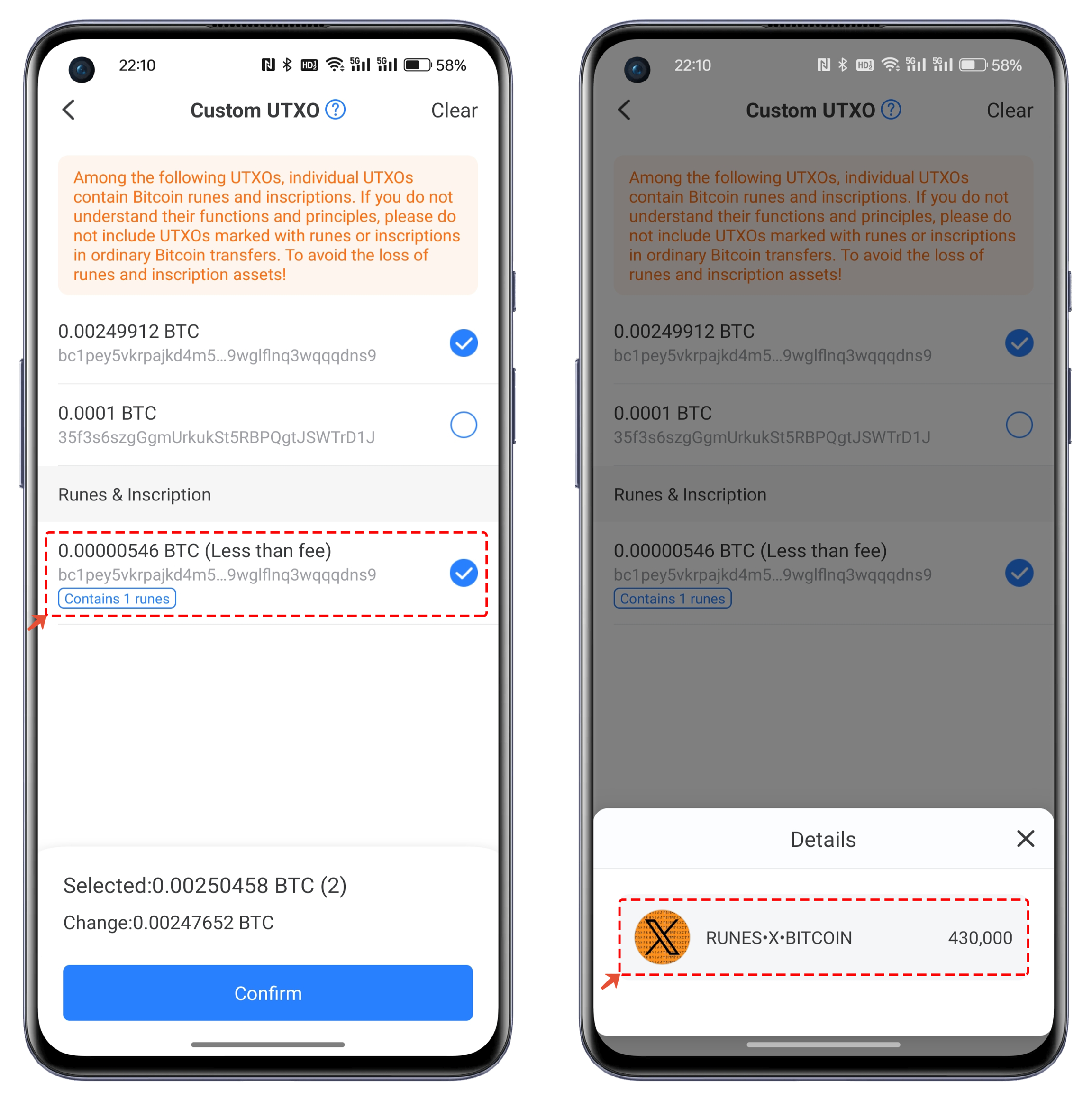 In the transfer interface, click on UTXO. You can customize it according to your needs. The list contains Gas (miner fee), where you can see the prompt "Contains 1 Rune". Click to view the specific details of the Rune.
