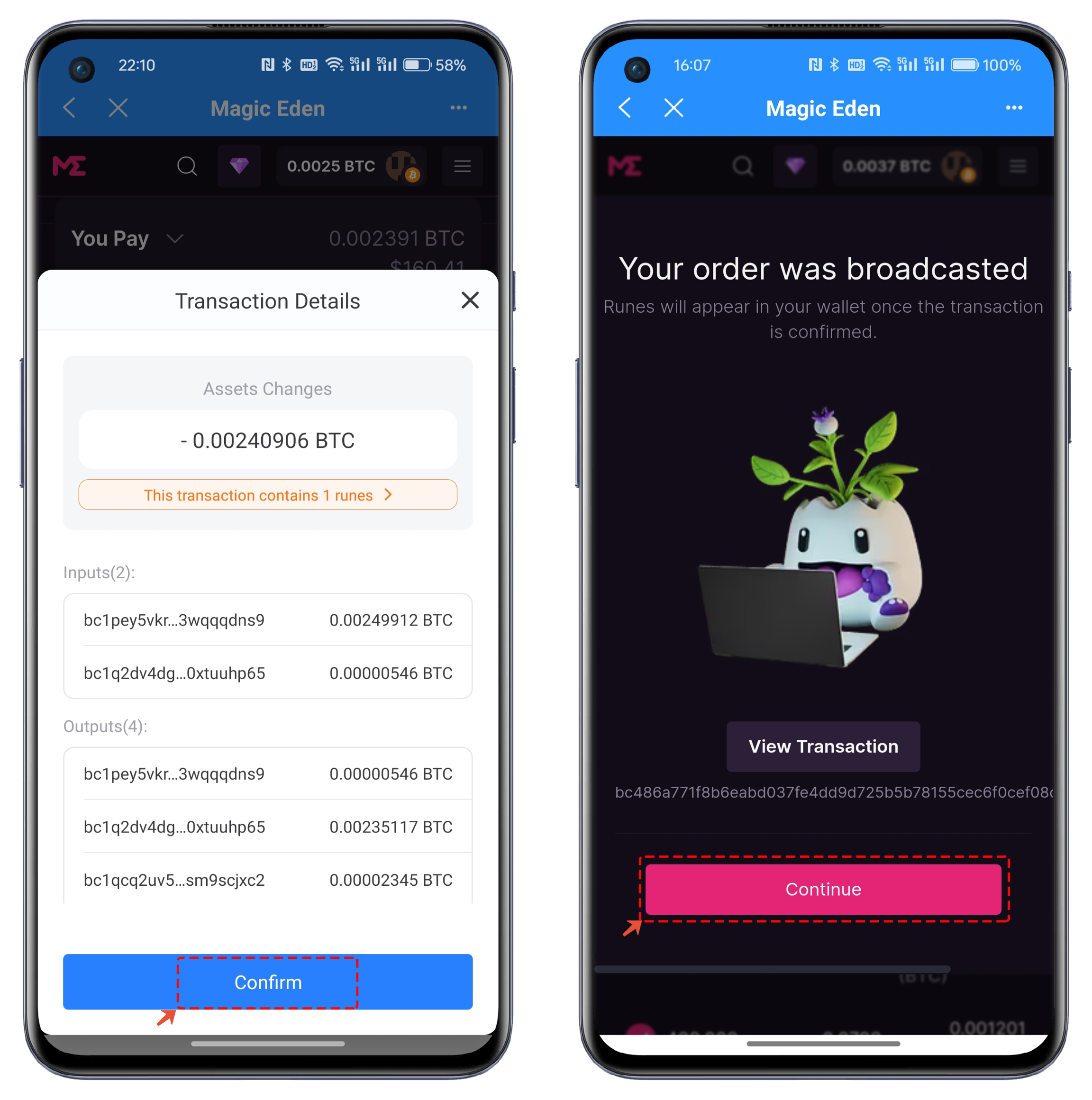 In the pop-up trading interface, click "Confirm" to sign. After signing, you will see a prompt screen. Click "Continue" to wait for the on-chain process to complete.