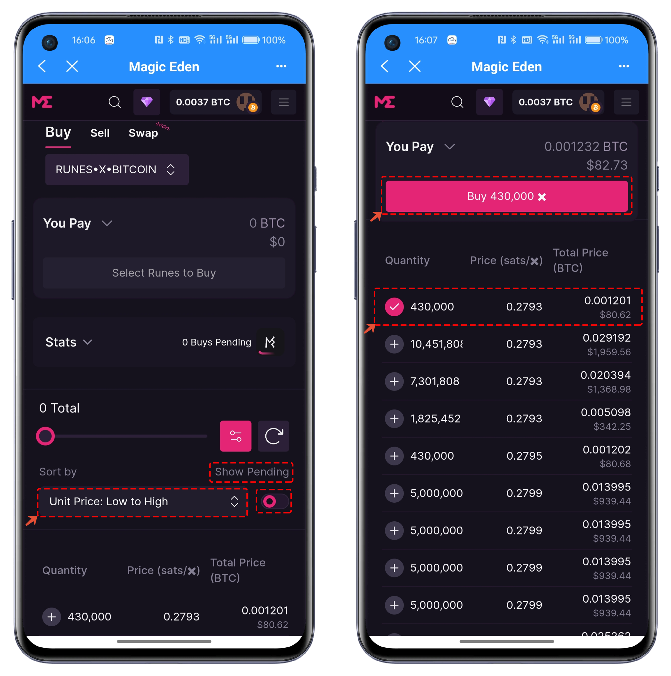 The current trading method is still order-based. Here, "Buy" and "Sell" are the main trading functions, while the more advanced "Swap" feature is still under development. In the purchase list, you can sort the orders based on various criteria. For example, we select a small order and check it. After checking, click "Buy 43000".