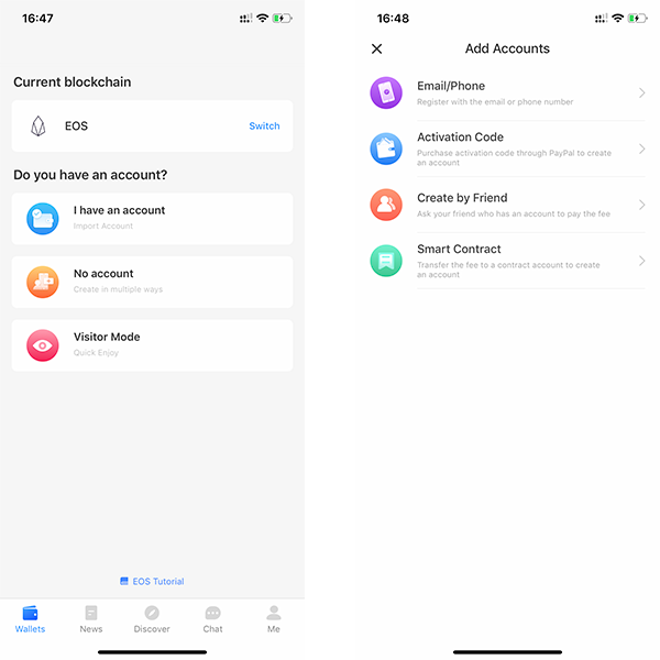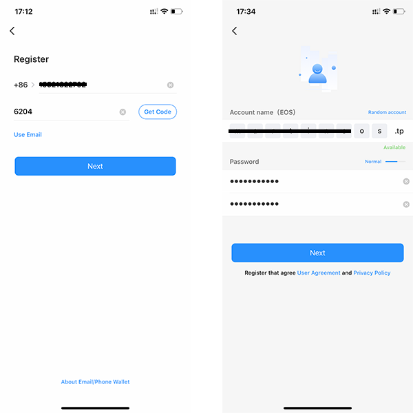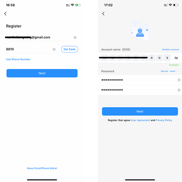 Select the blockchain like EOS first, then [No Account] > [Email/Phone].