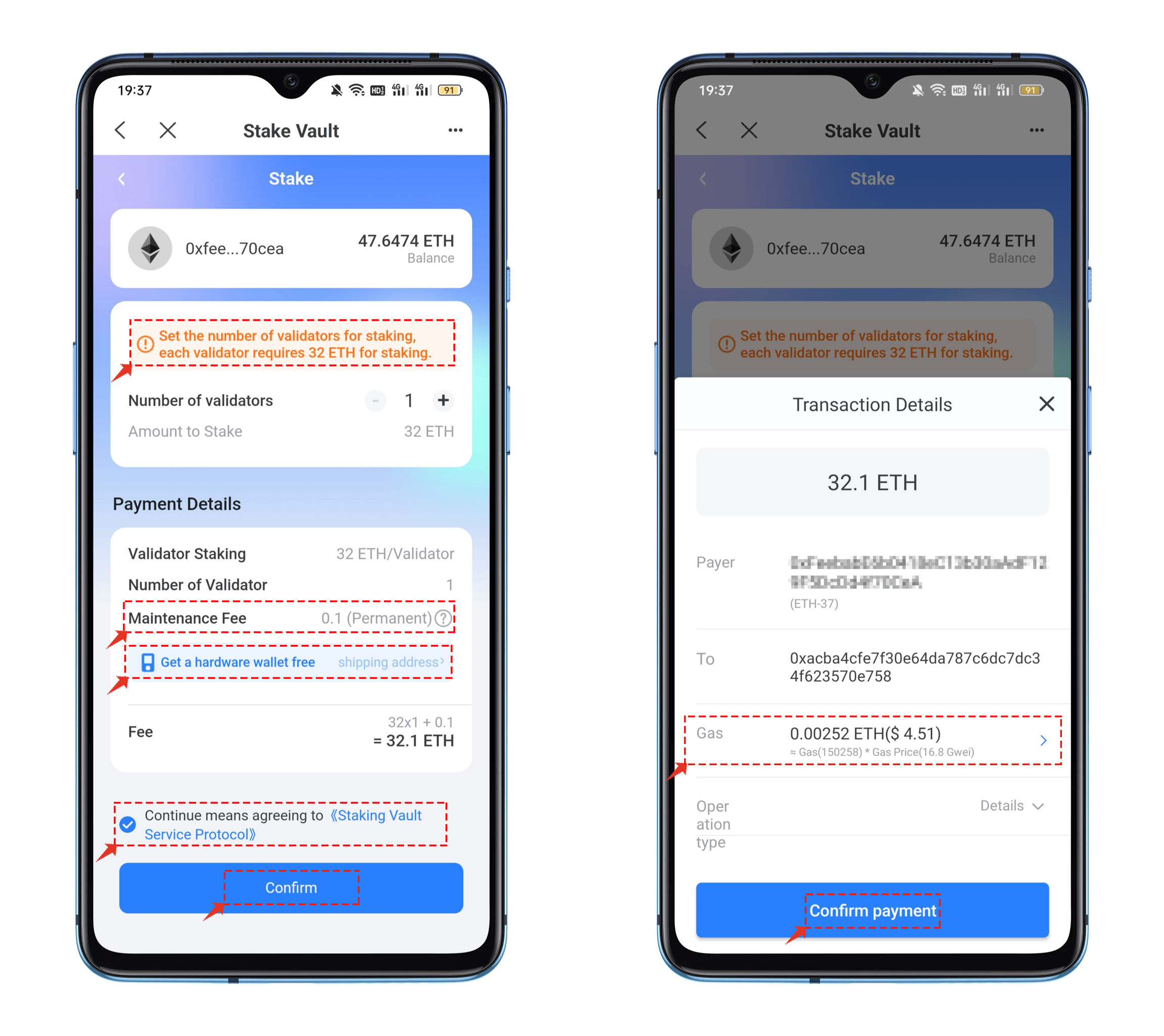 After viewing and selecting the [Staking Service Agreement], click on "Pay" to bring up the transaction details page where you can adjust the miner's fee according to your actual situation. Finally, click [Confirm Payment] and sign to complete self-hosted staking.
