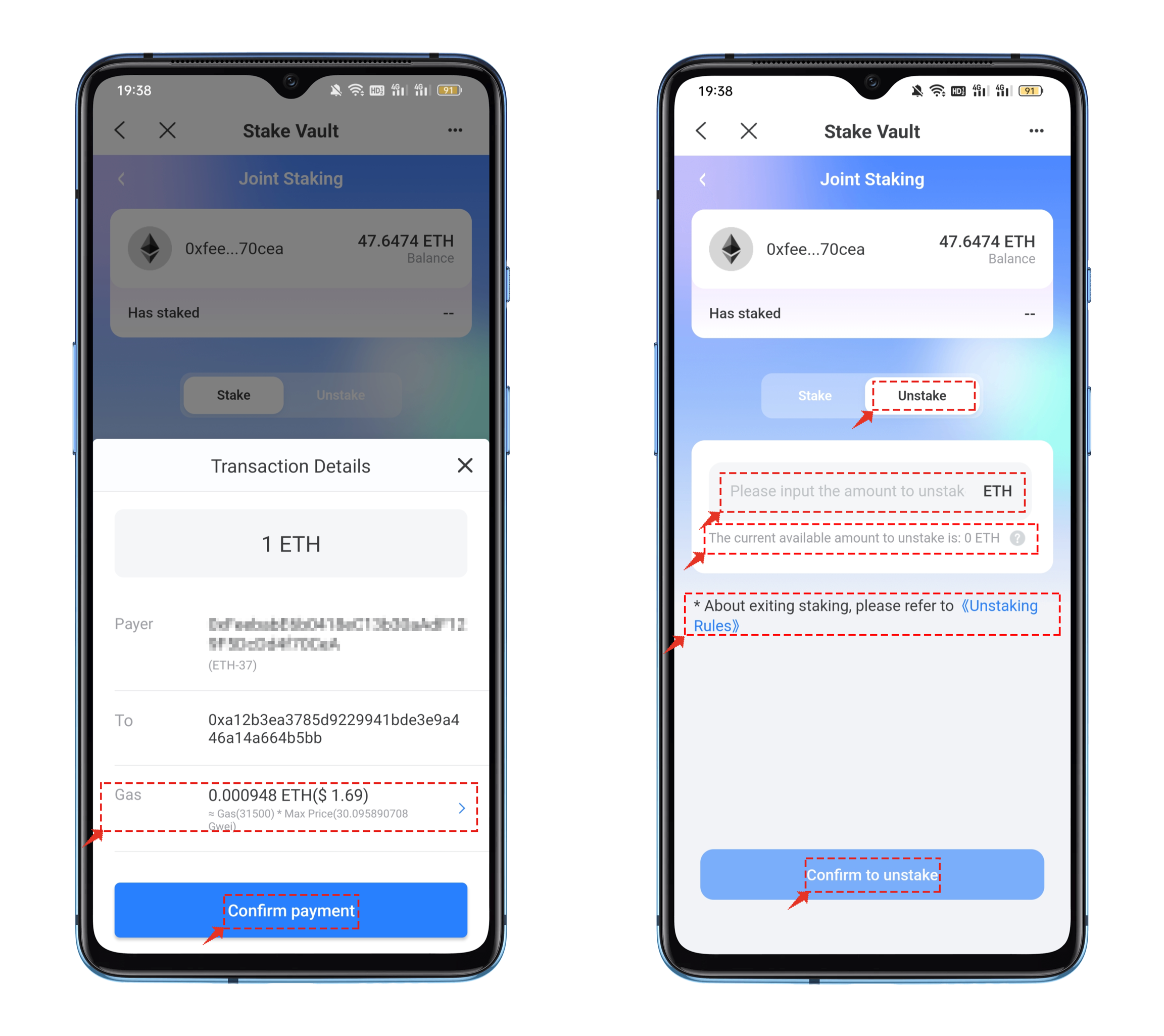 In the unstaking interface, you can see the amount that can be withdrawn below the input box. Fill in this number in the digital field, click [Confirm Withdrawal], and then confirm payment and signature on the transaction details page to complete the withdrawal process. (The rewards for participating in staking will only be available after ETH2.0 is officially launched.)