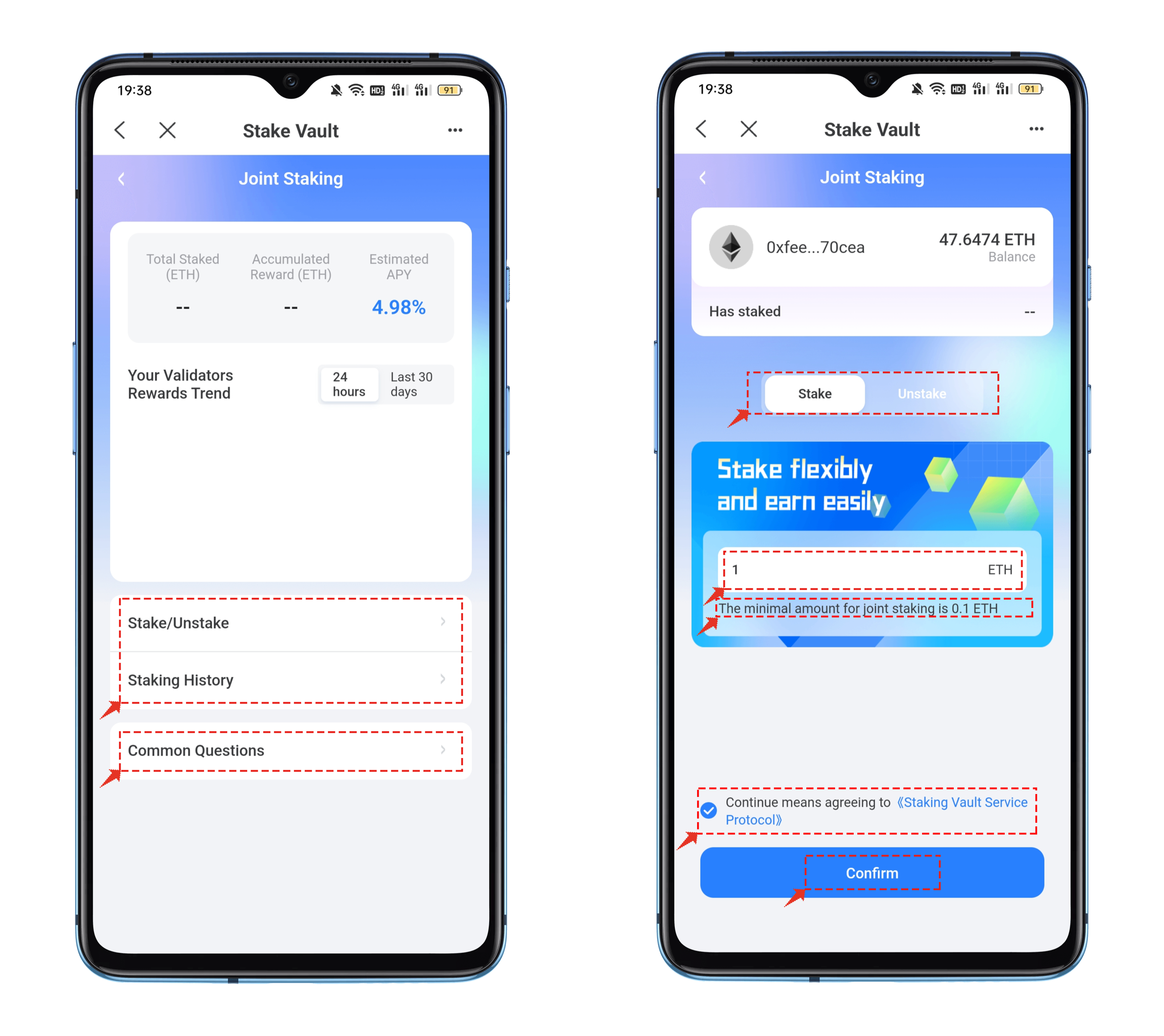 3.1 In the joint staking interface, you can view information such as stake data and validator's reward trends, as well as check "Staking History" and "Common Questions". Click on the "Participate/Exit Pledge" entry, select participate or exit (requires a unified window period) in the redirected interface, set your desired amount of ETH to participate, check and select the "Staking Vault Service Protocol", then click Confirm.