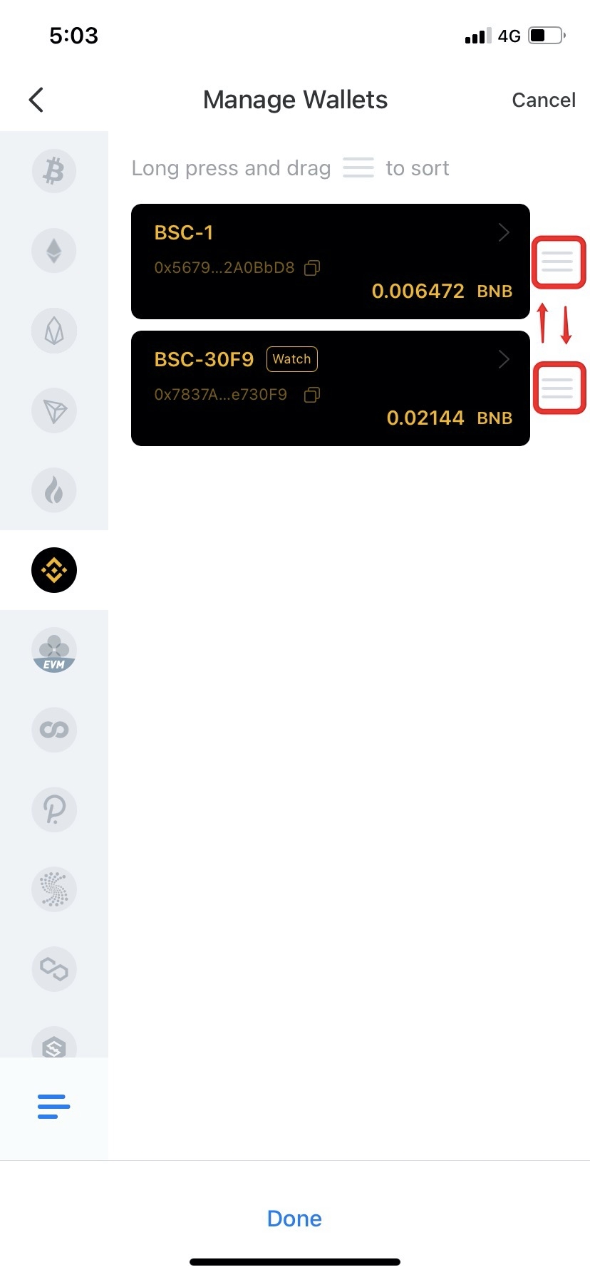 3. Long press and drag to sort wallets;